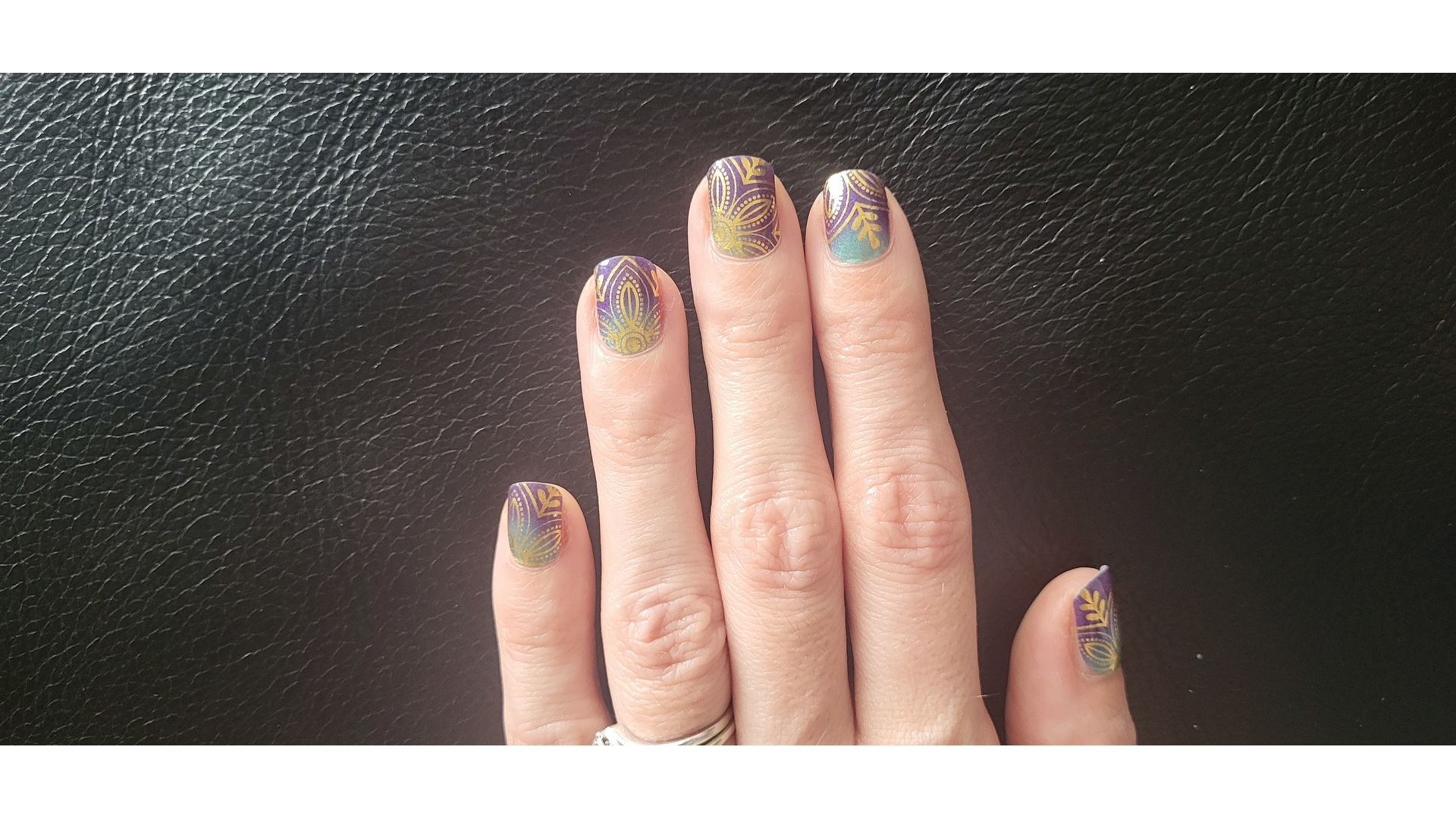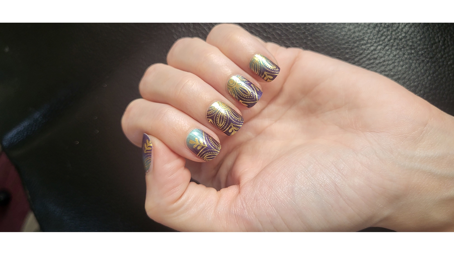Dark (Navy?) Blue, with a hint of turquoise and big gold flowers. I fell for these and had to apply immediately. They are gorgeous. Applied easily and lasted well