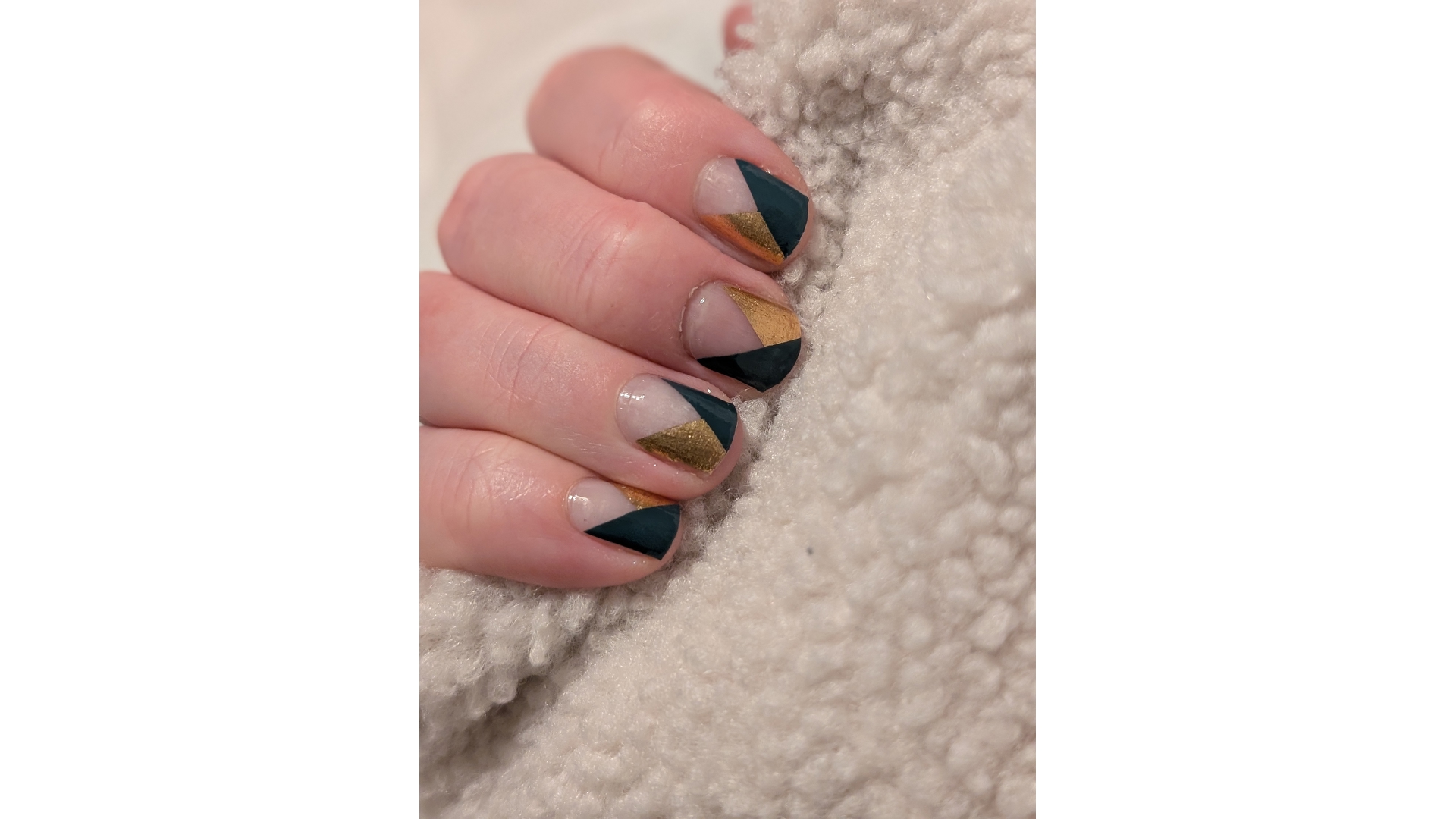 Classy design with deep teal glossy background and gold metallic foil with negative space at the cuticle to make this alternative french tip. Wear alone or layered over another colour