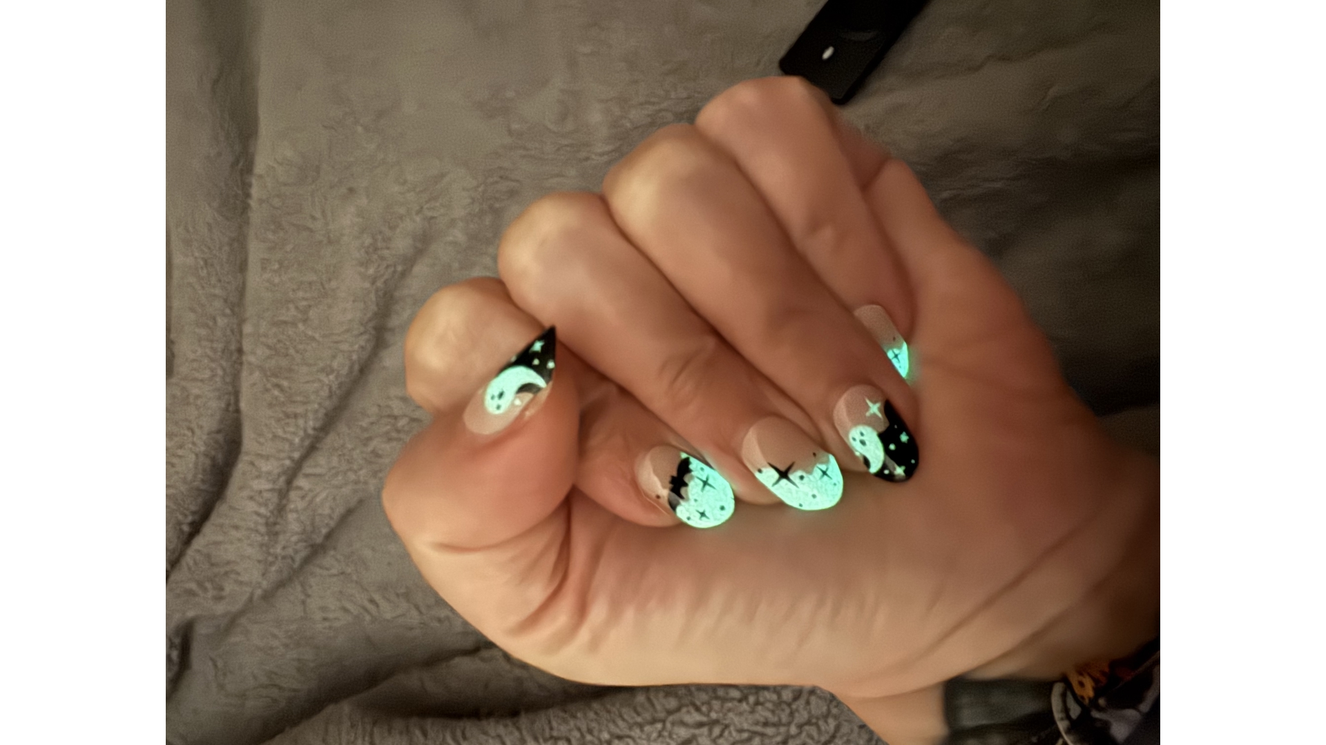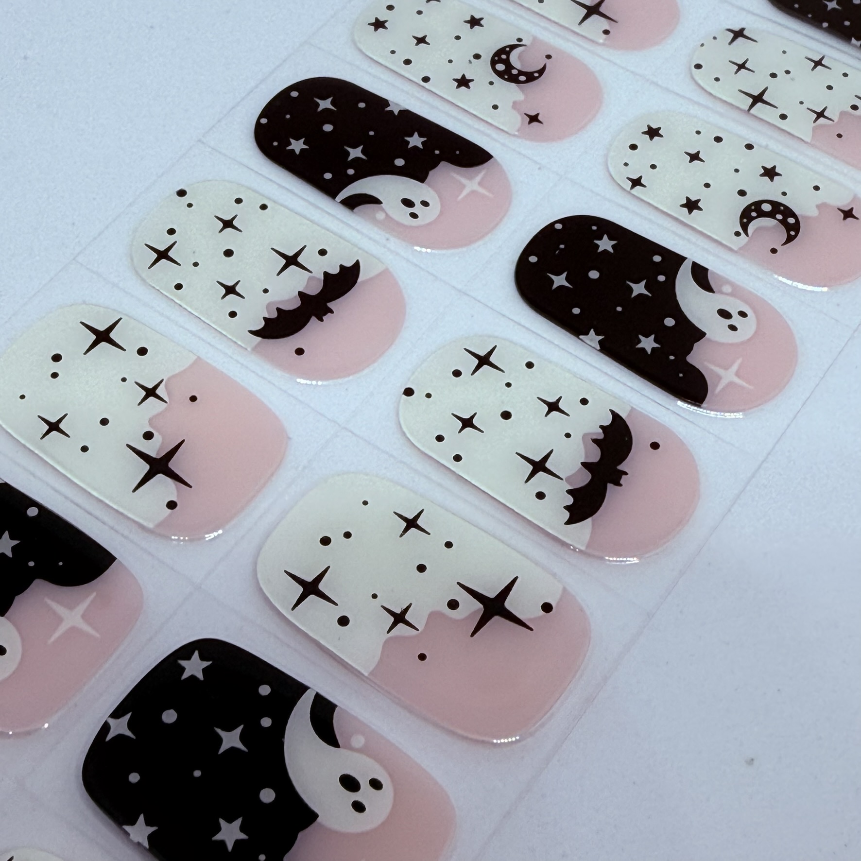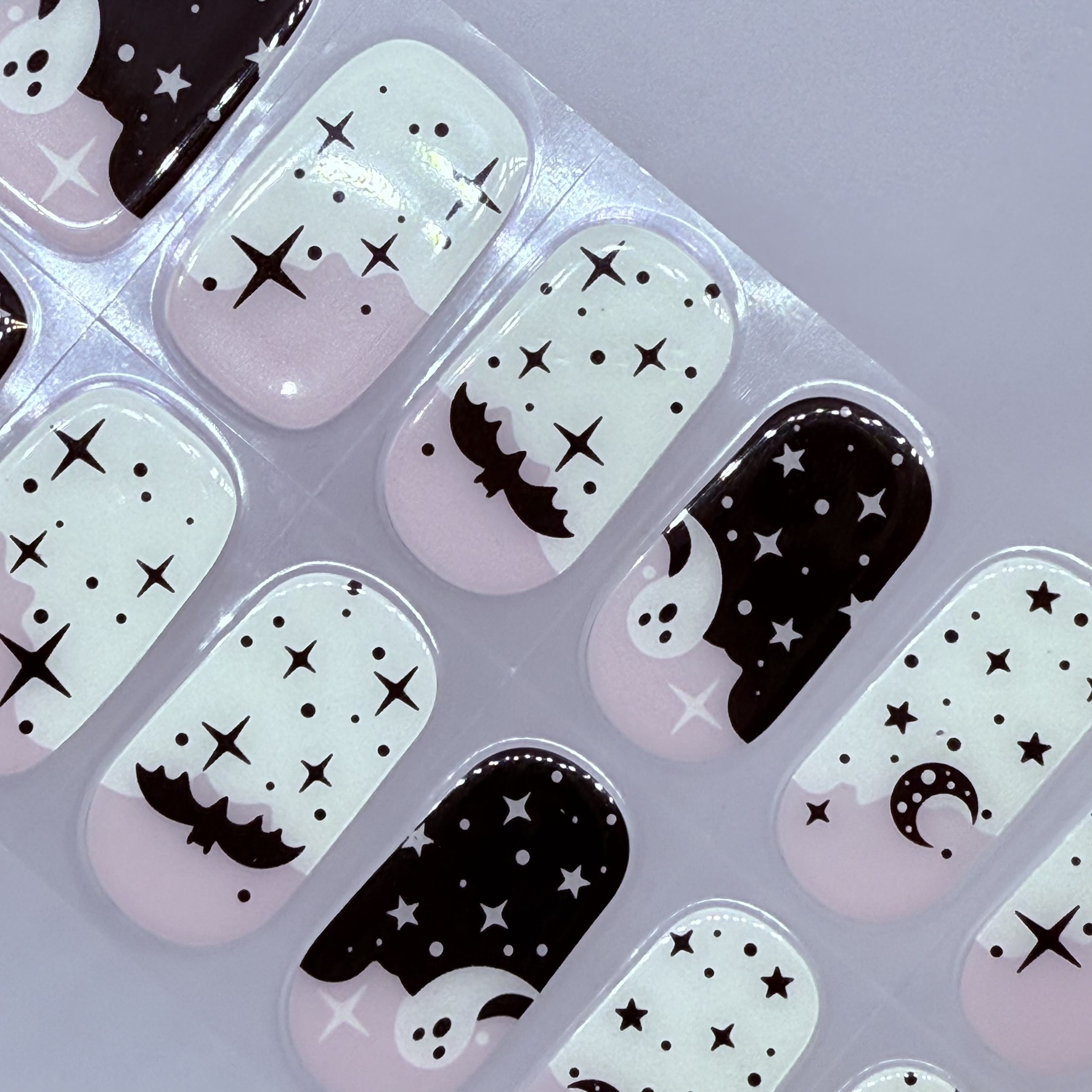 Give your French tips a haunting twist with After Dark! By day, these nails show off chic monochrome tips with stars, moons, and playful ghosts but when the lights go out, they come alive with an eerie neon glow. Perfect for Halloween nights, parties, or anyone who loves a little magic after midnight.