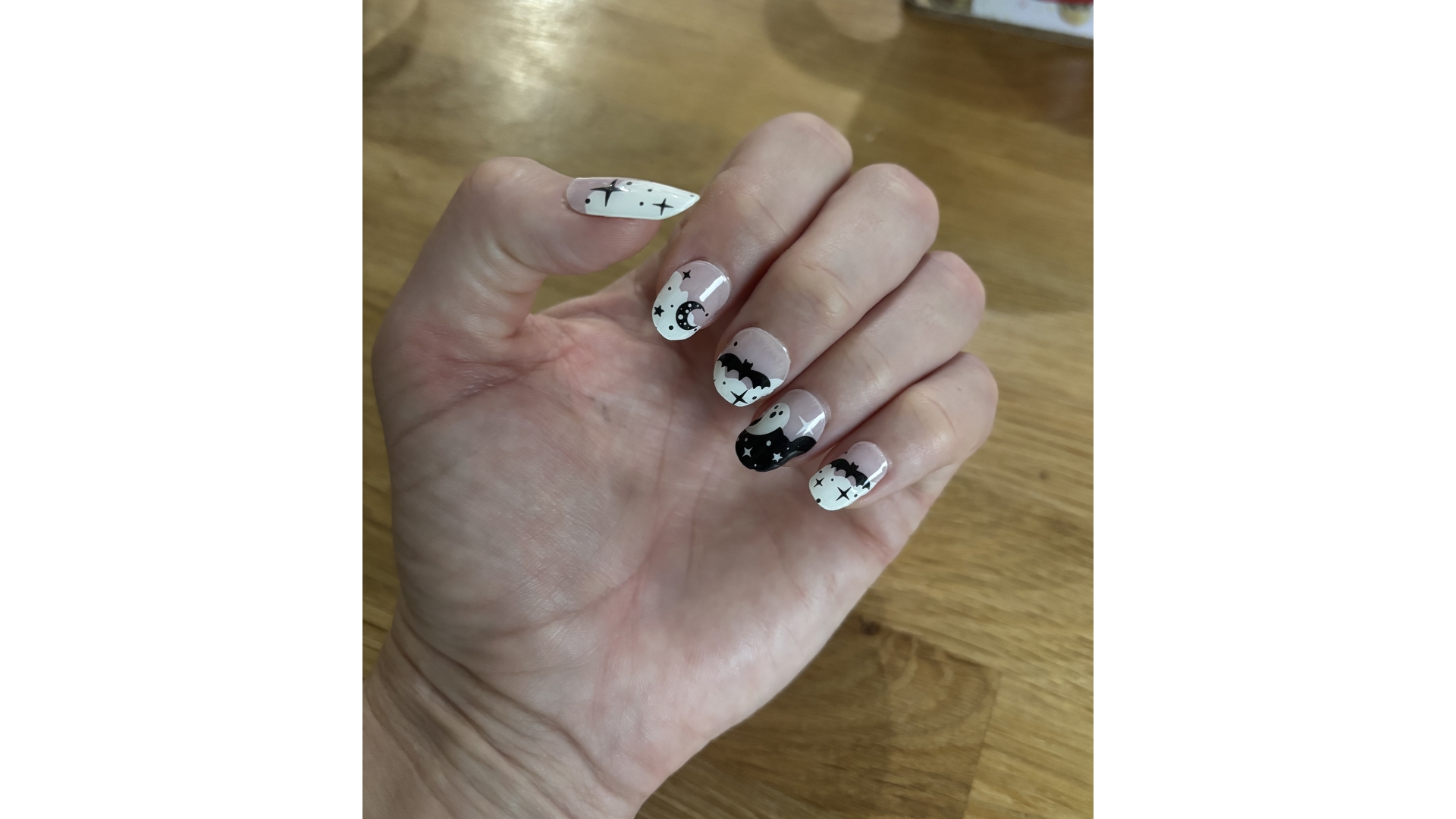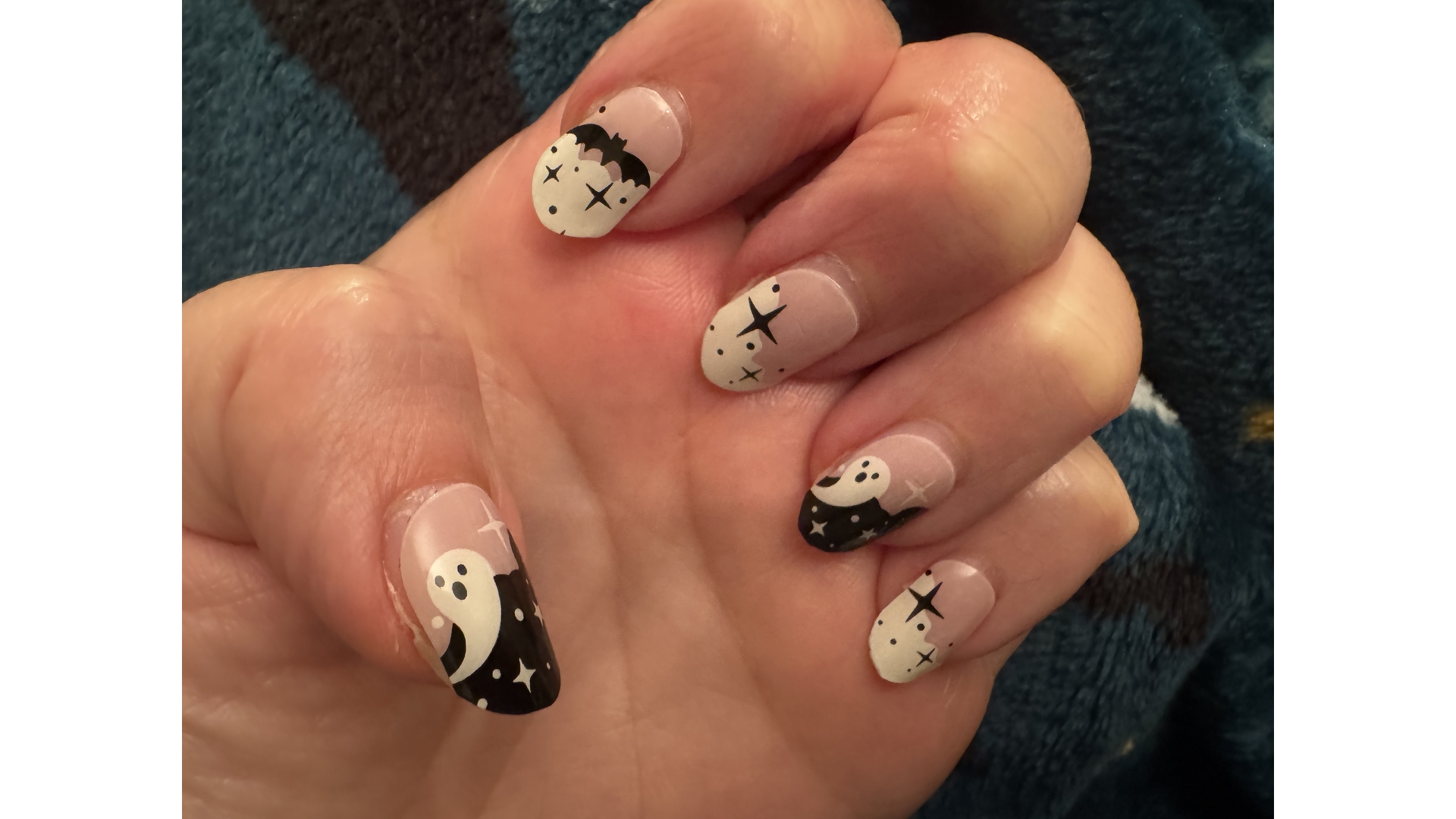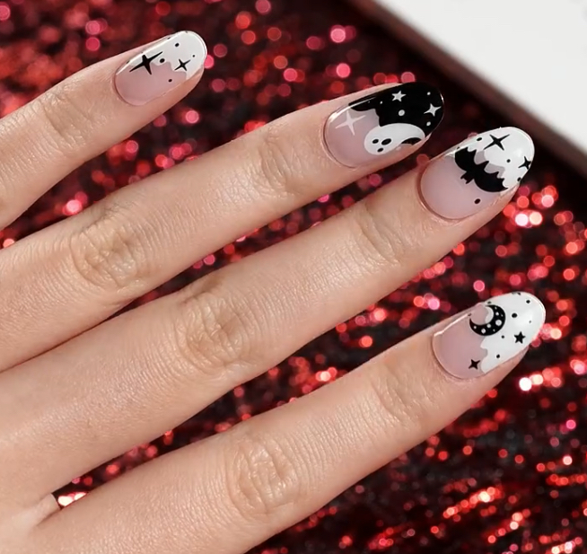 Give your French tips a haunting twist with After Dark! By day, these nails show off chic monochrome tips with stars, moons, and playful ghosts but when the lights go out, they come alive with an eerie neon glow. Perfect for Halloween nights, parties, or anyone who loves a little magic after midnight.