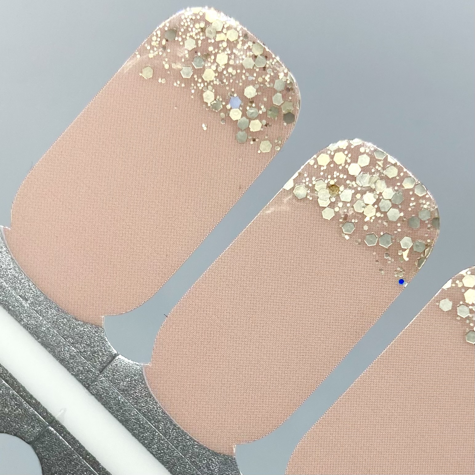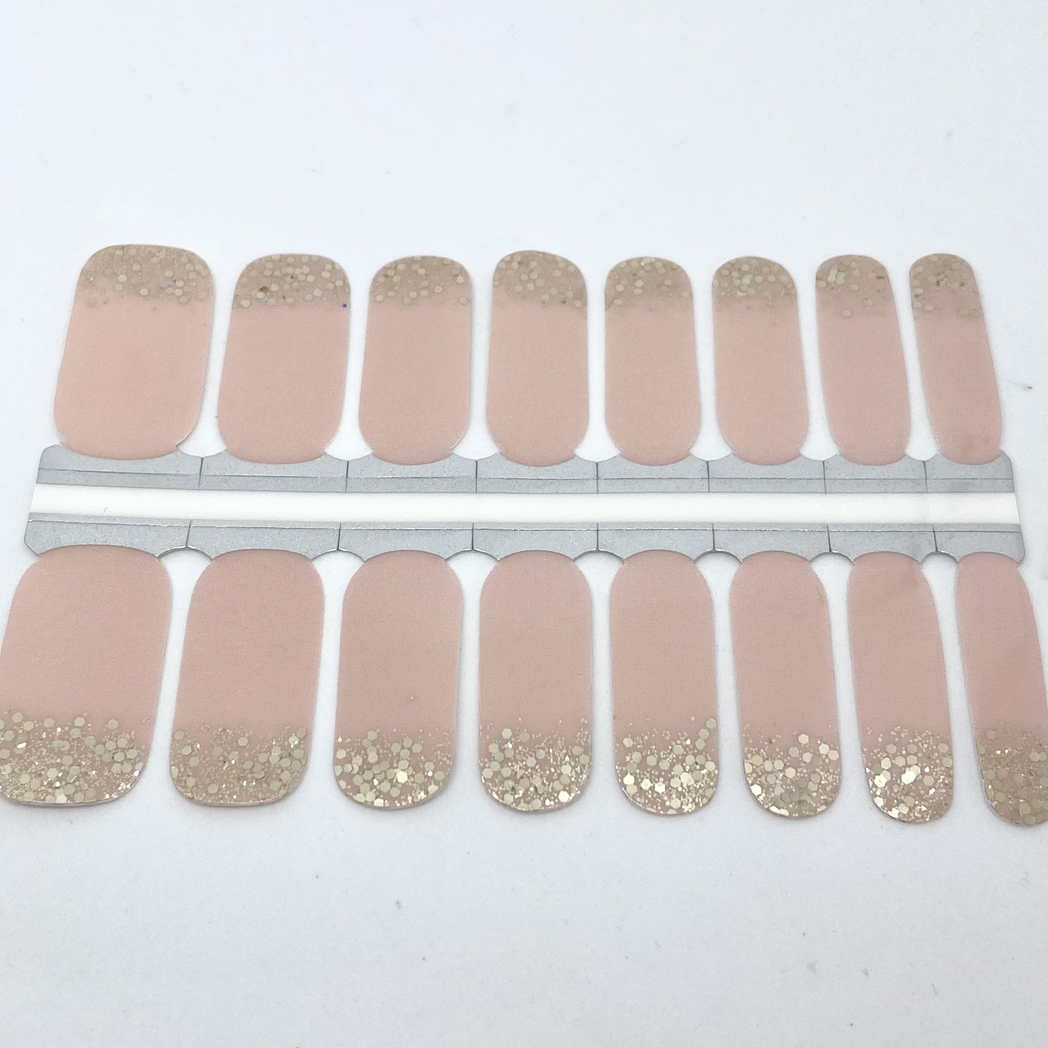 Classy and smart design with a peach pink solid with champagne gold confetti glitter cuticles.