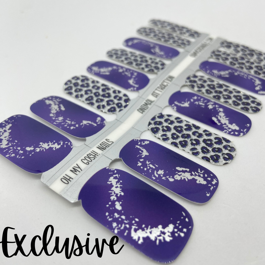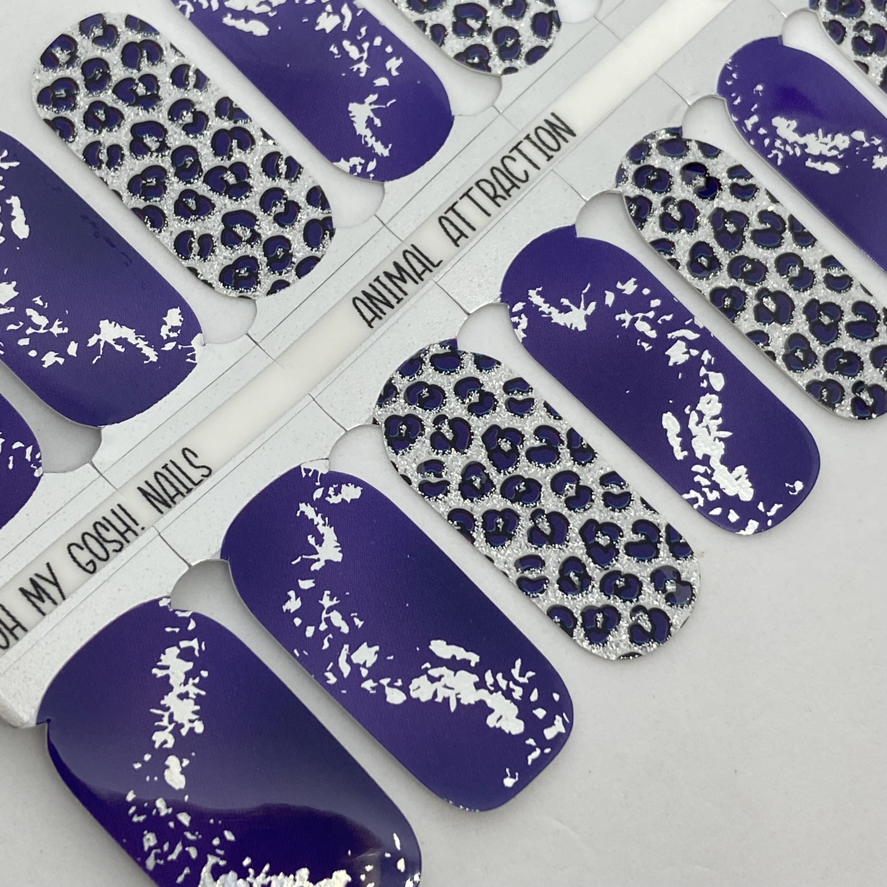 Unleash your wild side with Animal Attraction! This fierce set pairs deep, electric purple wraps with dazzling silver foil accents—and the star of the show? A bold animal print laid over a sparkling silver glitter base that’s pure glam. Whether you're on the prowl or just feeling fabulous, these wraps add instant drama, danger, and diva energy to your claws. It’s fierce, it’s flirty, it’s exclusively for the bold—meow, baby!