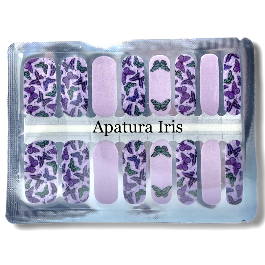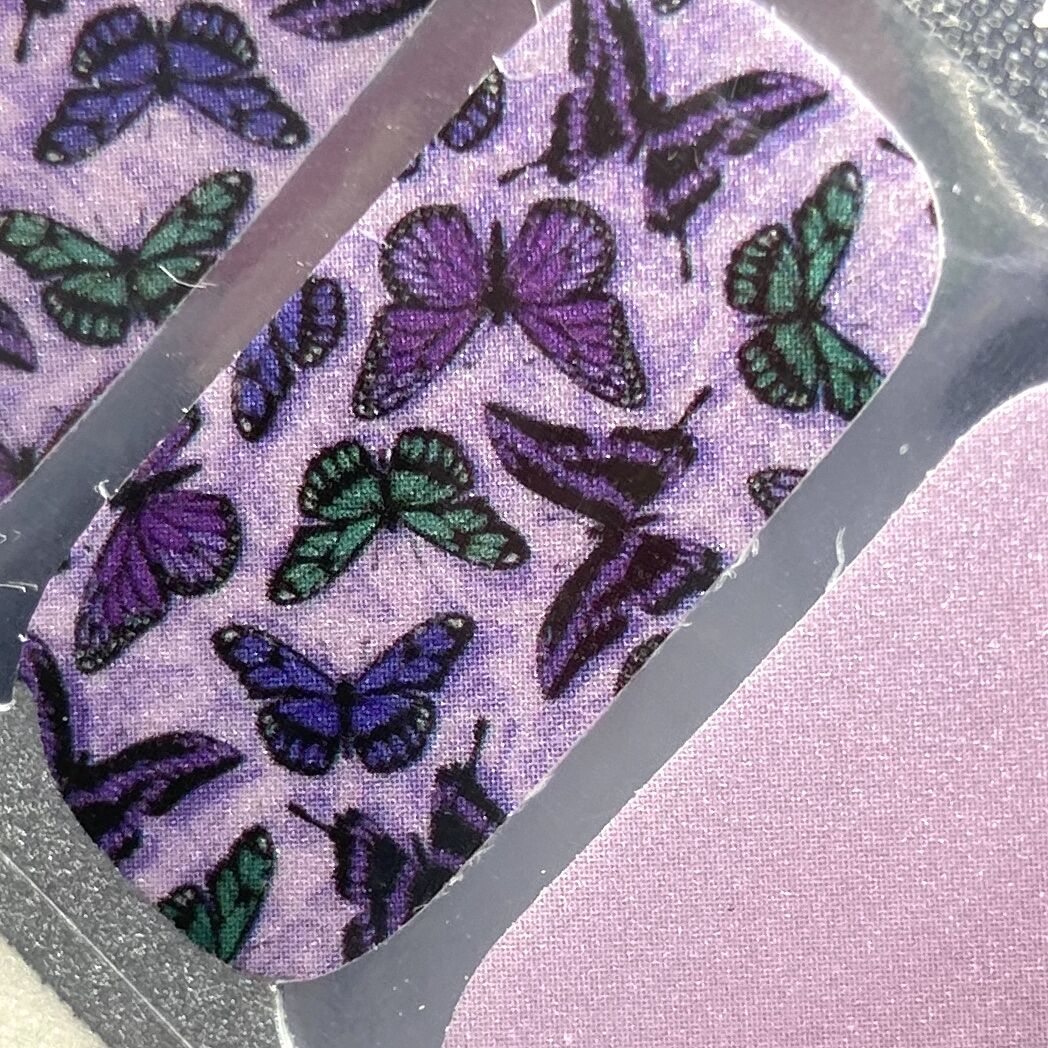Such a beautiful design! Beautiful purple and green butterflies, fluttering over a lilac shimmery background.