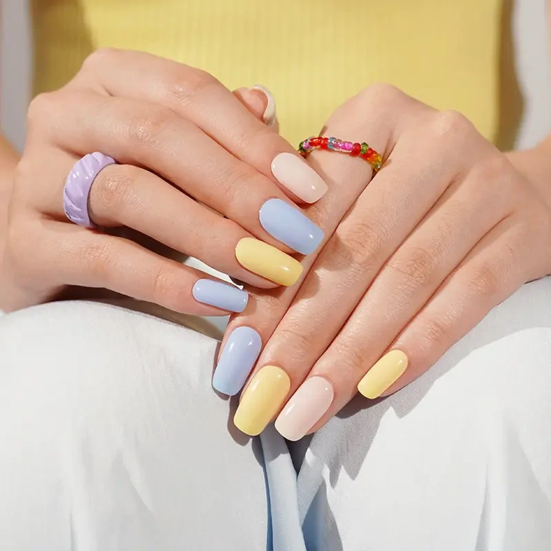 Catch those breezy beach vibes with pale blue, sunny lemon, and milky white skittles—fresh, fun, and fabulously easy to wear!