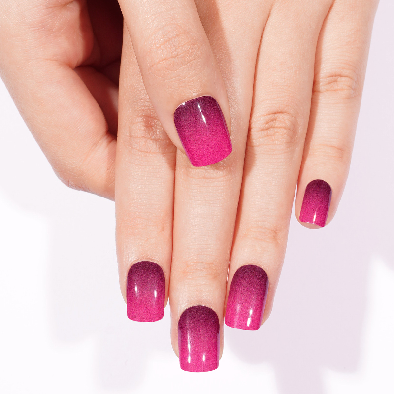 Berry Blush blends vibrant hot pink into rich raspberry tones in a seamless ombre finish. The smooth glossy surface enhances the colour shift from bright to deep, giving your nails depth and dimension without overpowering sparkle.