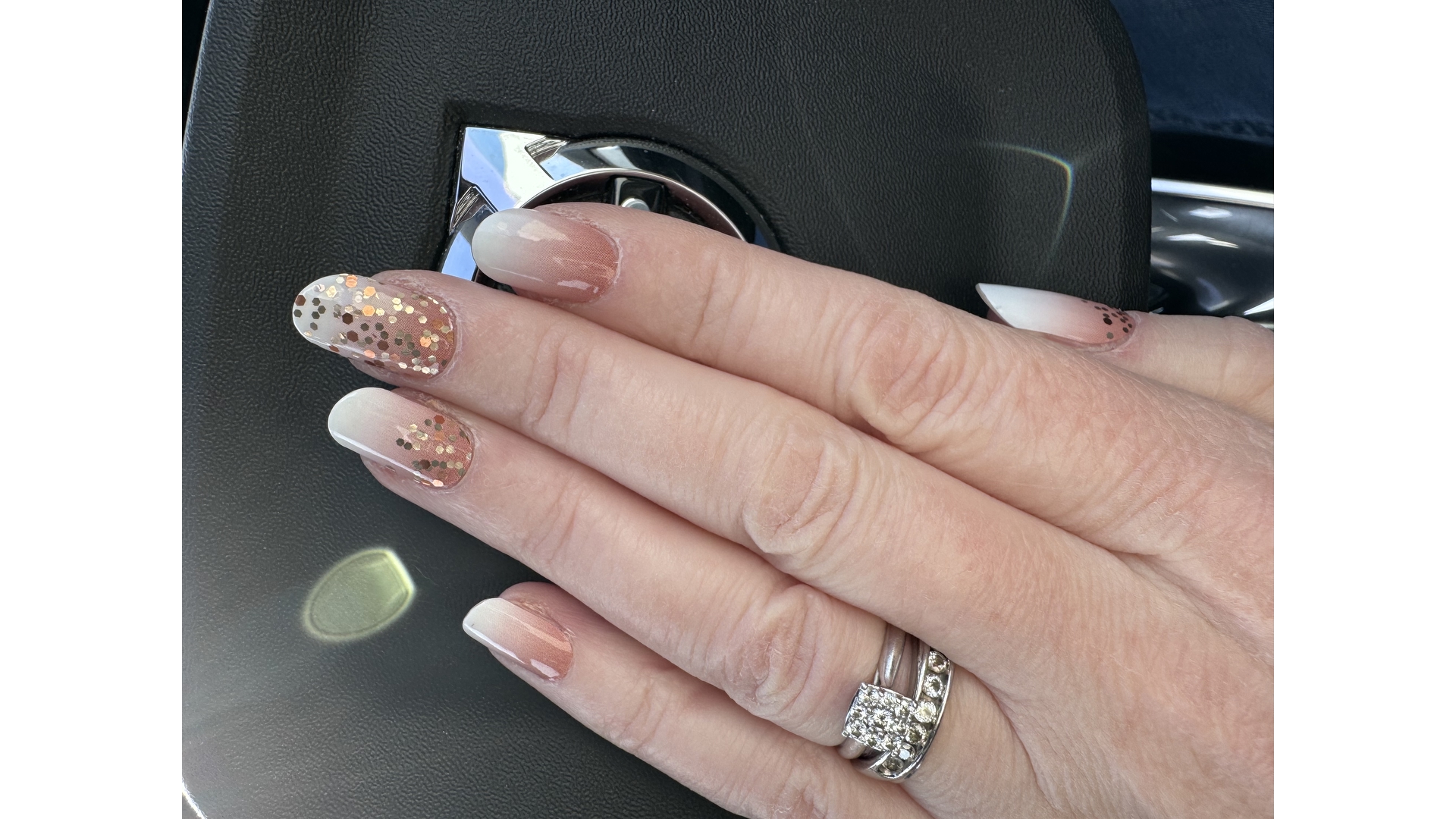 Boomer Glam is a firm favourite for dressing up the plain Baby Boomer nails! Featuring a neutral beige pink to white ombré, with a hit of bronze glitter to accent, this is class at its best.