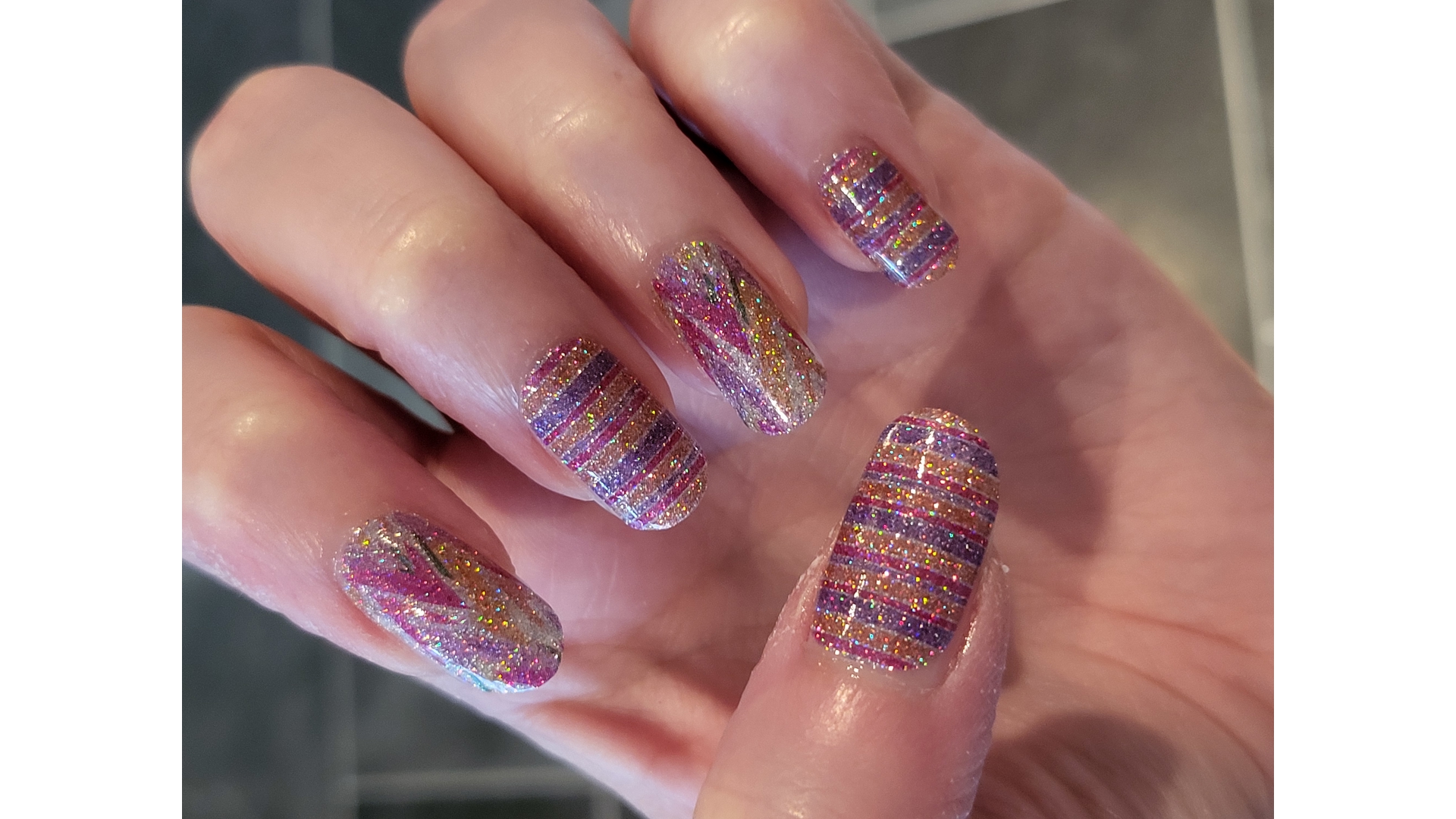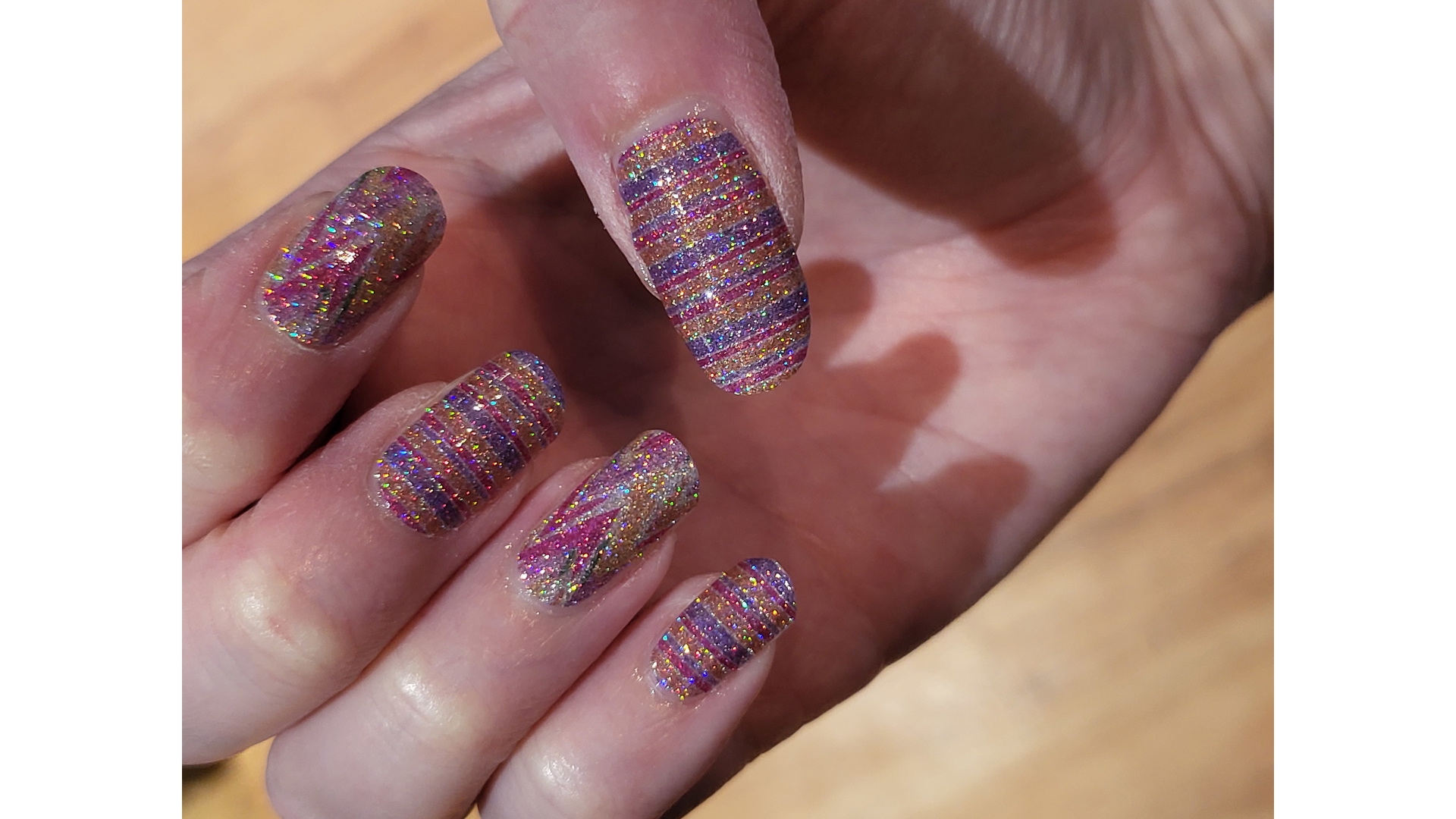 Stripes and chevrons in pink, purple, green and gold on a holographic laser glitter base.