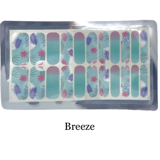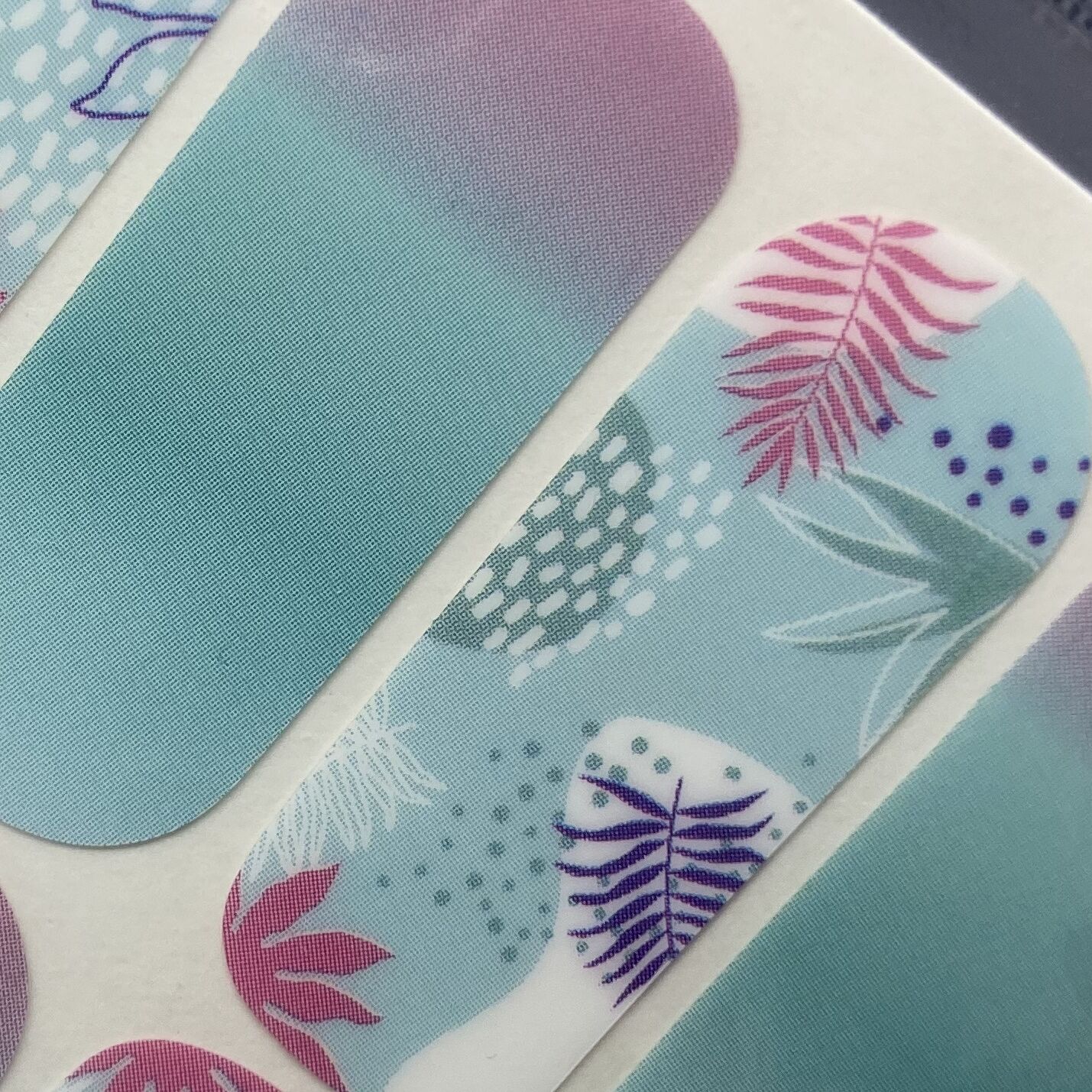 A tropical print with matching ombres in pastel aqua blue, pink and purple.