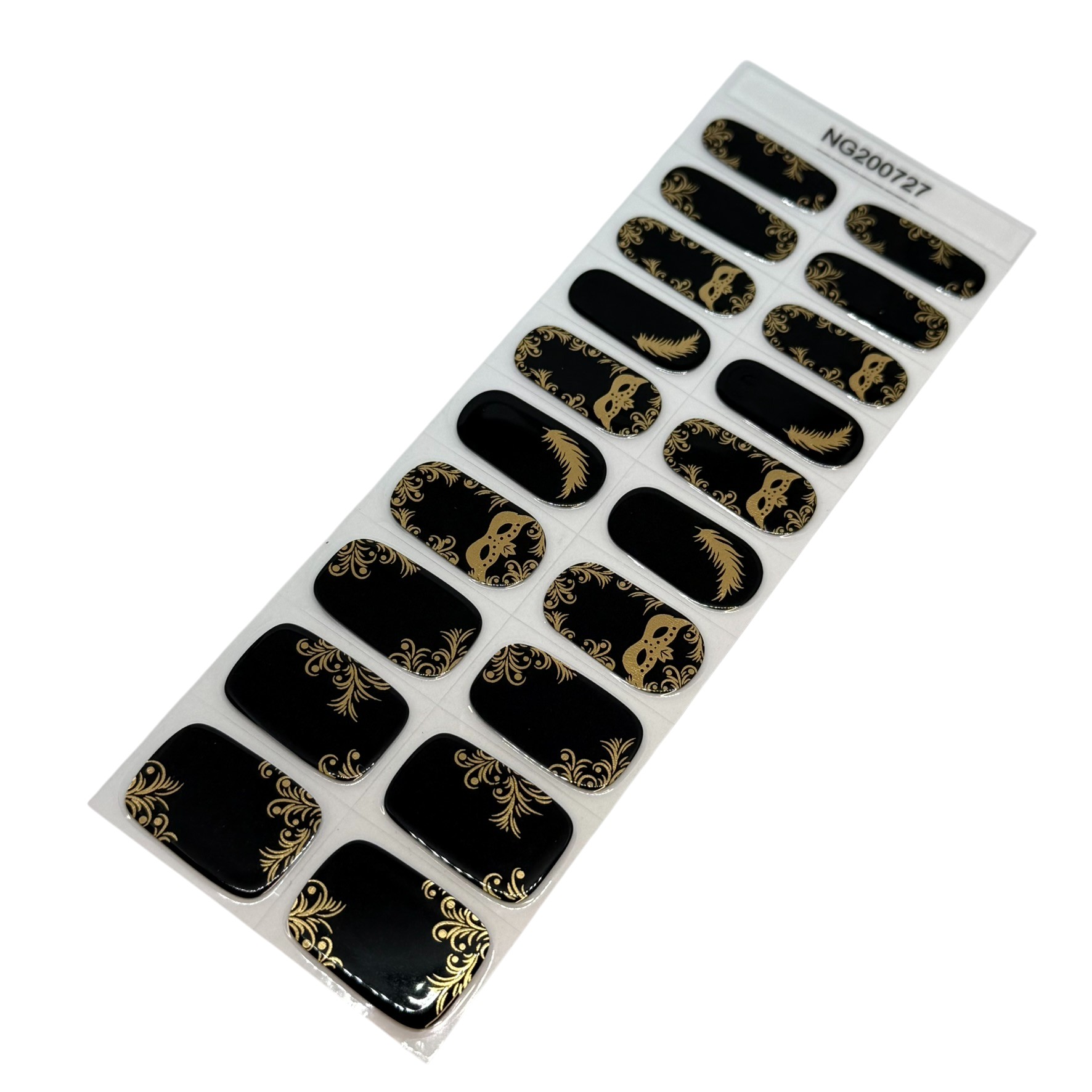 A glossy jet black base adorned with intricate gold foil scrollwork and feather details, inspired by masquerade balls and Regency romance. Elegant, dramatic and made for pure main character moments.