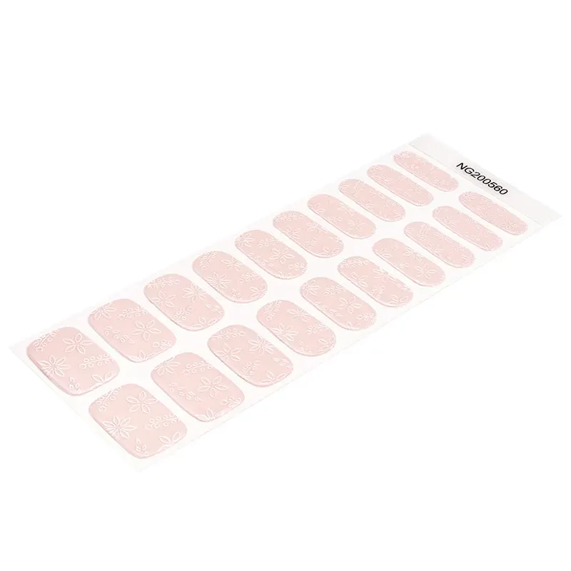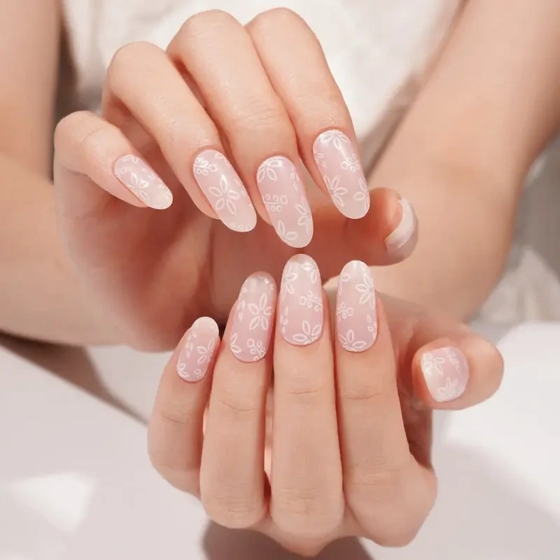 A delicate and understated design, reminiscent of Broiderie Anglais material, with a soft neutral pink semi sheer base with outlines of flowers and leaves which are topped with white mermaid chrome powder.
