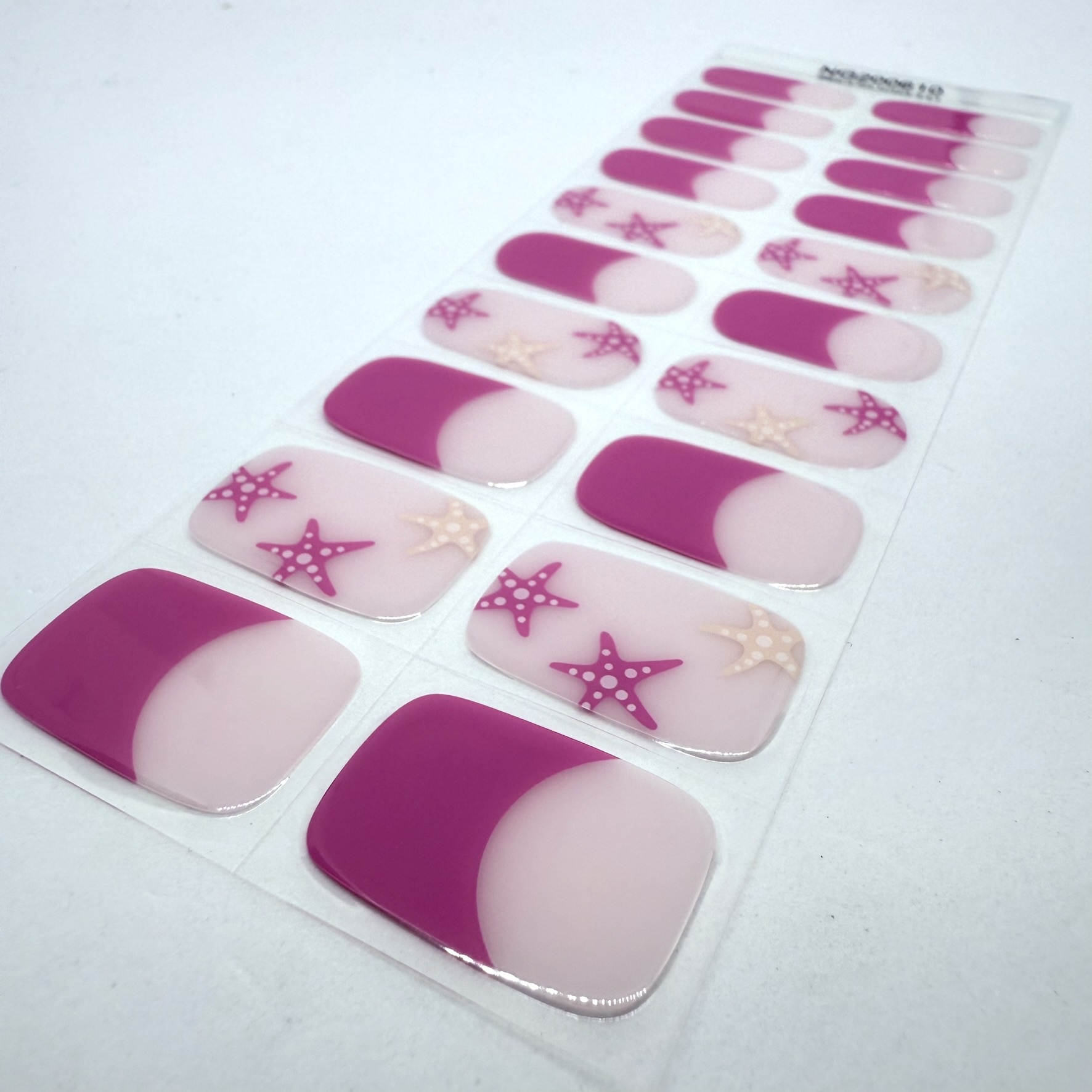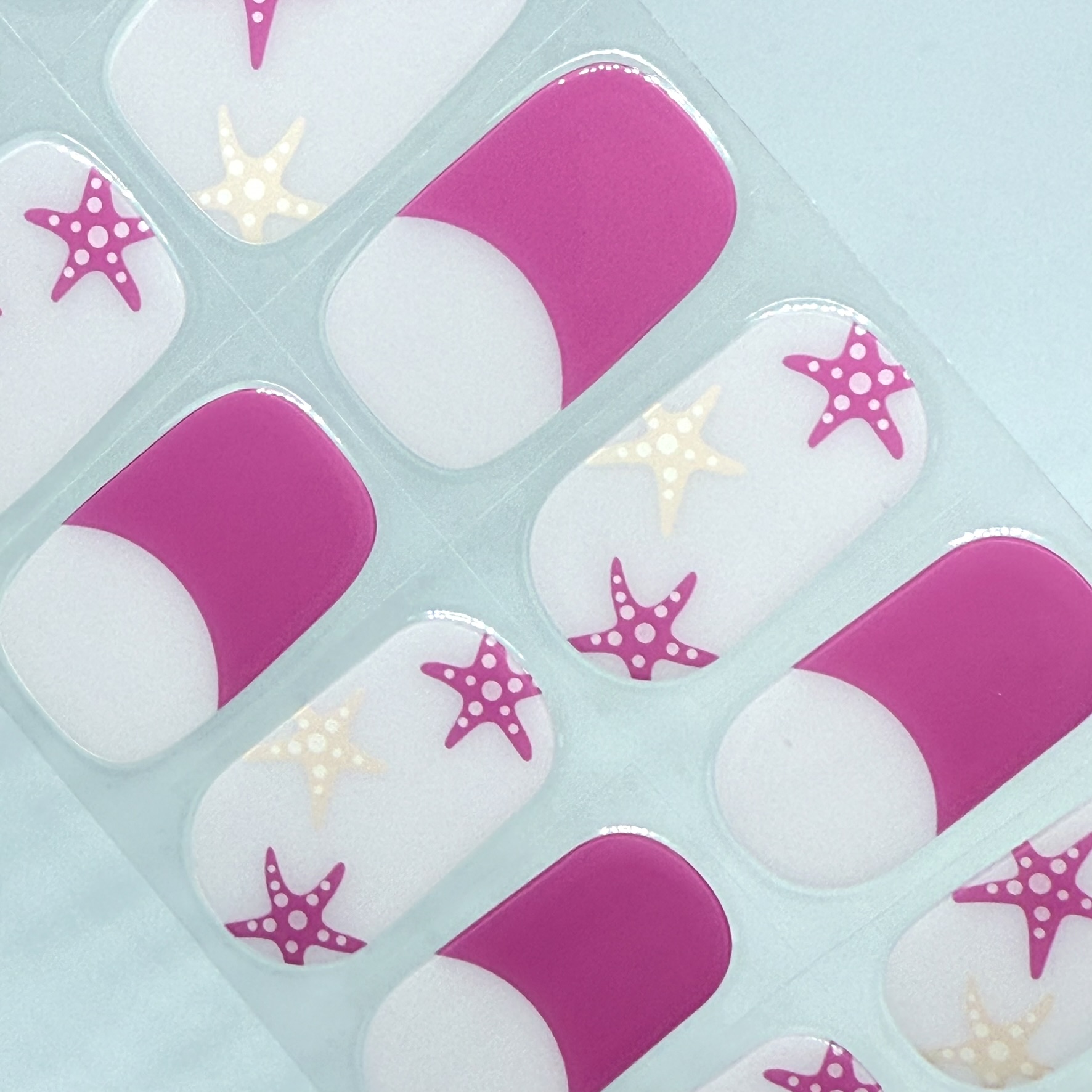 Bright, bold, and totally fun! This sweet combo features vivid pink tips and scattered cream and fuchsia starfish on a soft pearlescent white base. Perfect for a splash of summer sass with a side of seaside magic.