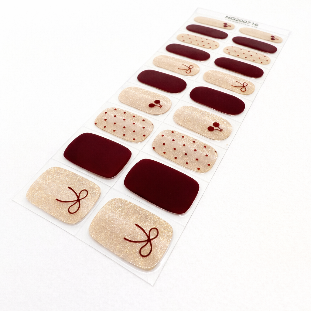 Rich glossy burgundy, fine champagne cat eye sparkle and the sweetest little cherry, bow and dot details.