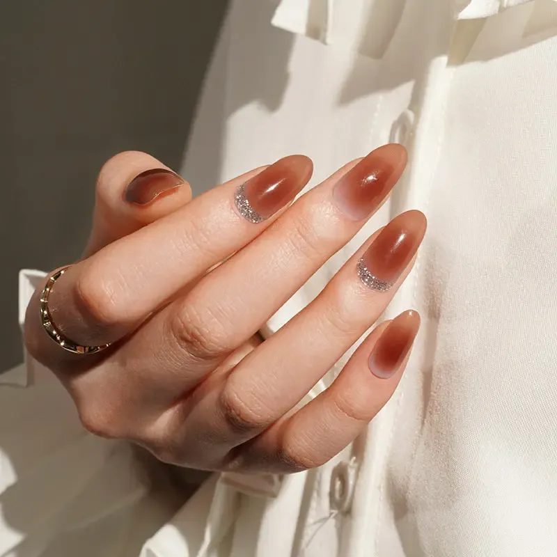 Semi sheer brown ombre and aura with silver glitter cuticle moons as accents.