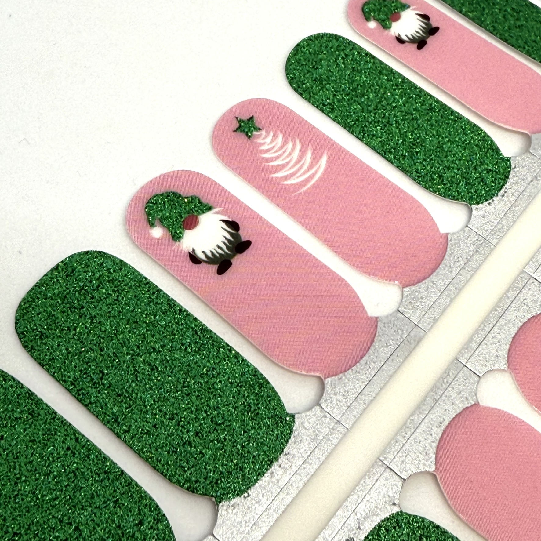 Say hello to the cutest little holiday helpers your nails have ever seen. This set pairs a soft rosy pink base with the sweetest gnome characters in green hats, complete with tiny noses and fuzzy white beards. Delicate white Christmas trees add a touch of magic, while the rich green glitter solids bring full festive sparkle. It is playful, cosy and packed with charm, perfect for anyone who loves a dash of whimsy with their winter glam.