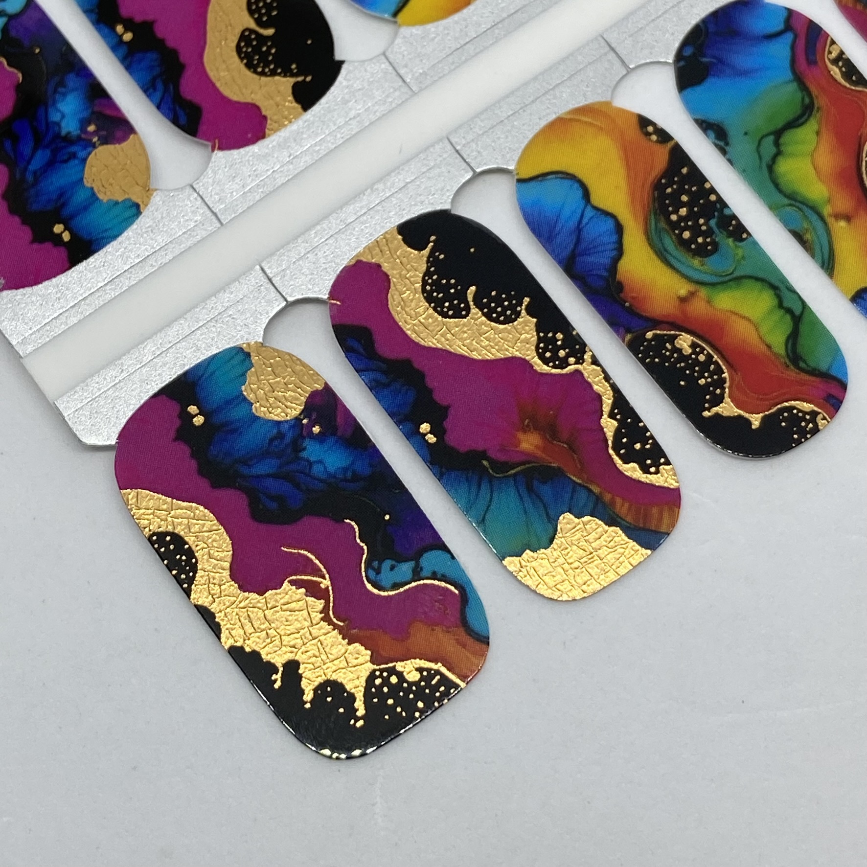 Colour Cascade features a bright acrylic paint pour splashed design with gold metallic foil areas.