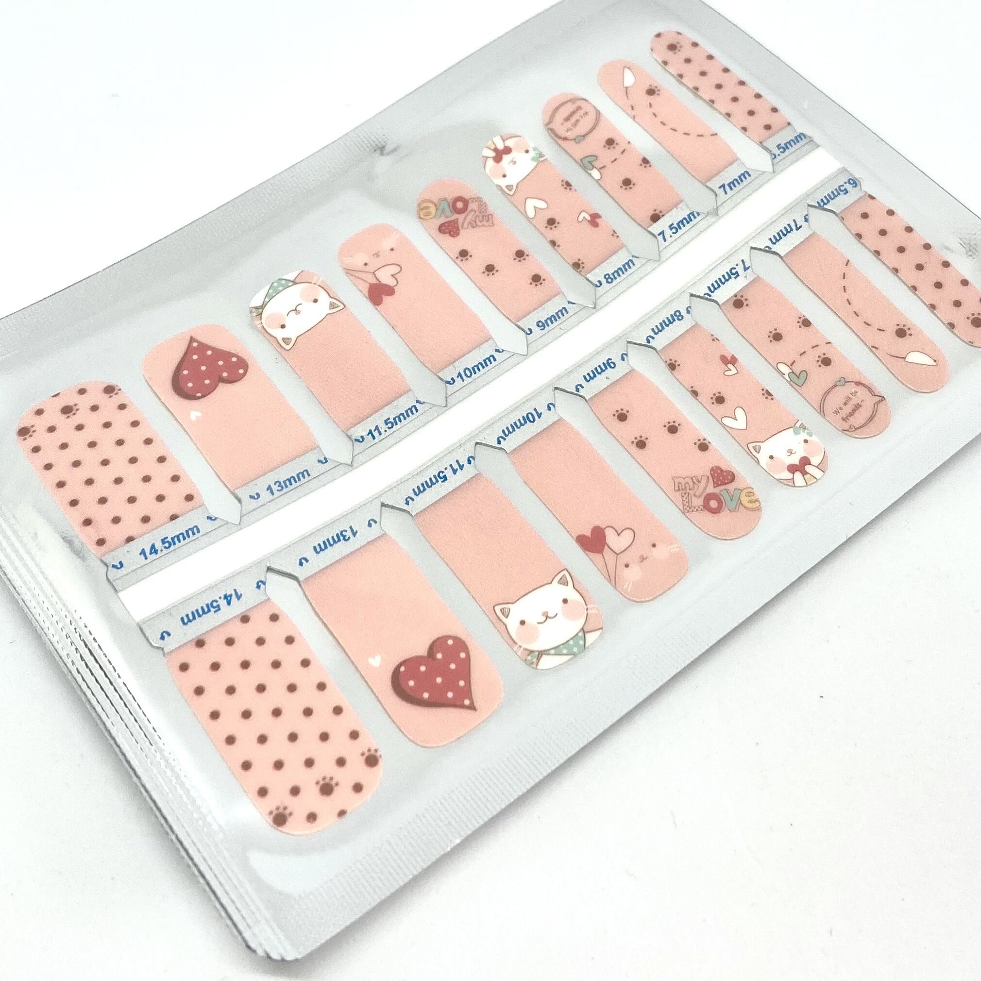 Cute cats, polka dots and footprints, and lots of hearts on a pinky peach background.