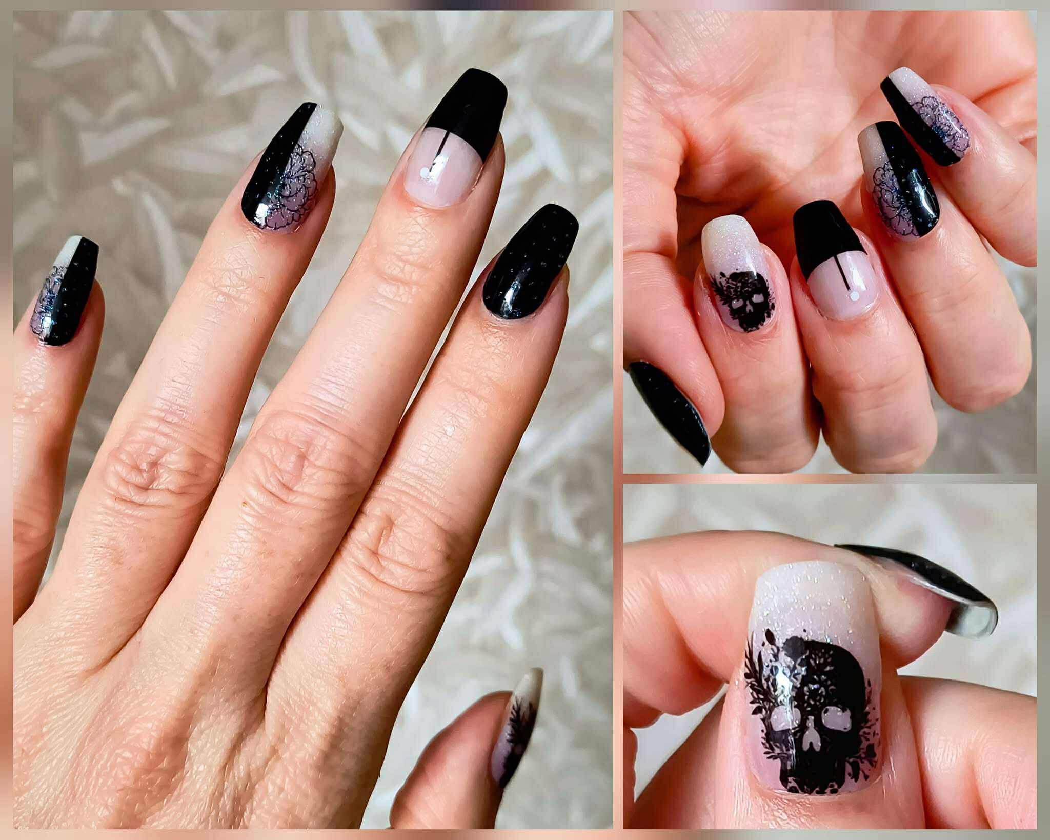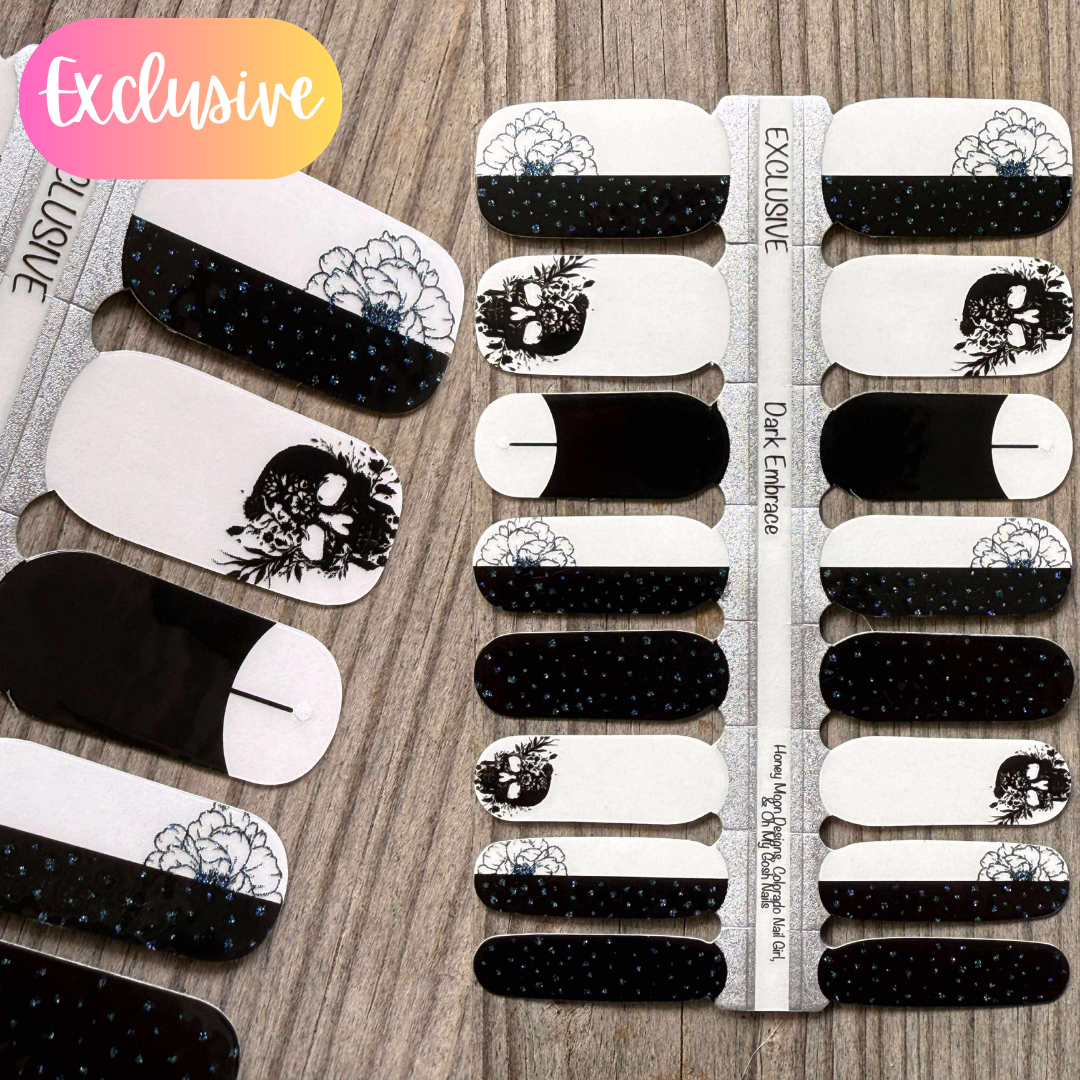 Dare to go bold with Dark Embrace. Featuring shifting glitter details across inky black sections and delicate florals, paired with transparent bases for a layered effect. Finished with haunting skull-and-bloom accents, this design blends elegance with edge - perfect for those who love a little dark romance.