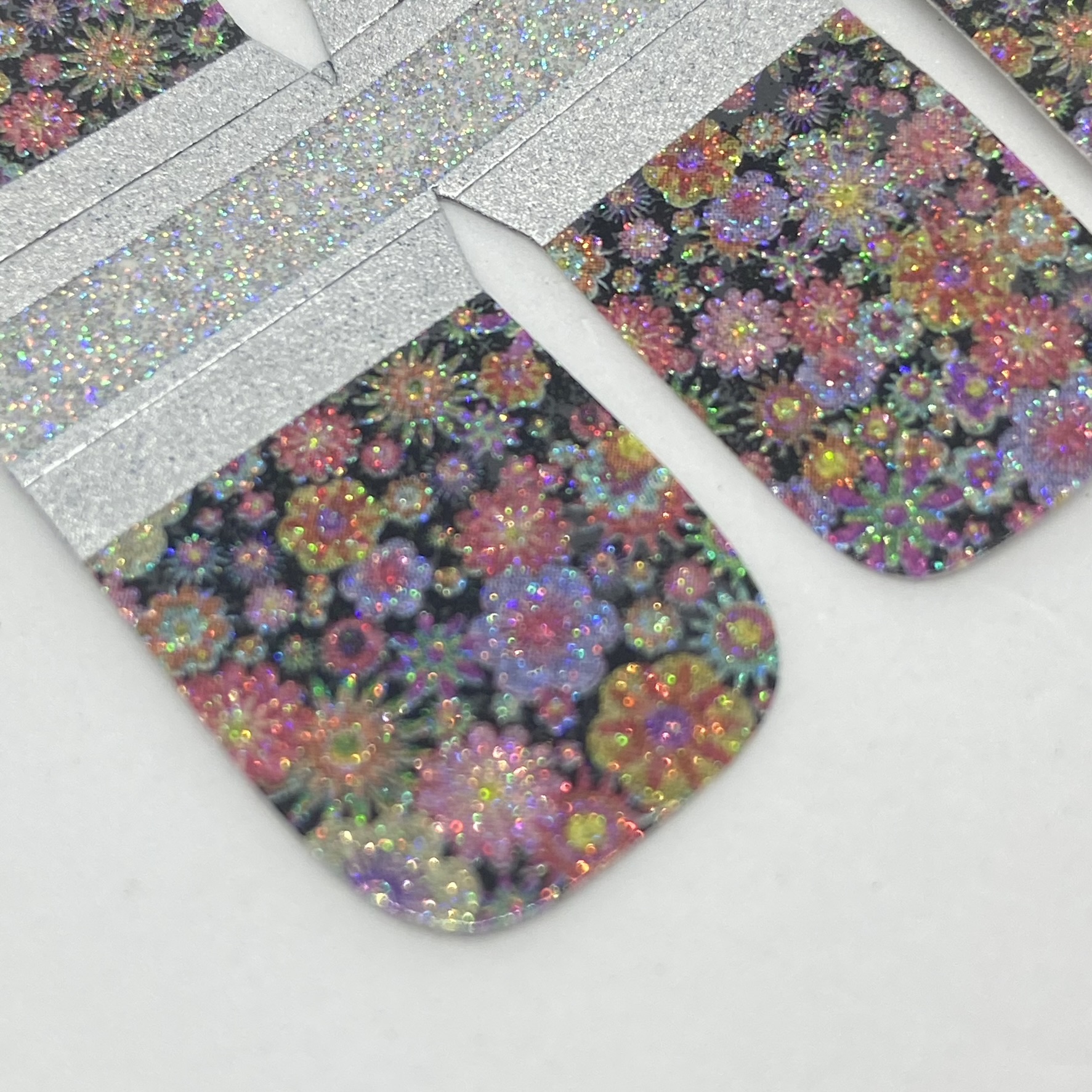 Sparkly glitter pedi packof mini flowers on a black background. Matches our Dazzling Daisies mani pack. Pedi packs are specially sized for toes.