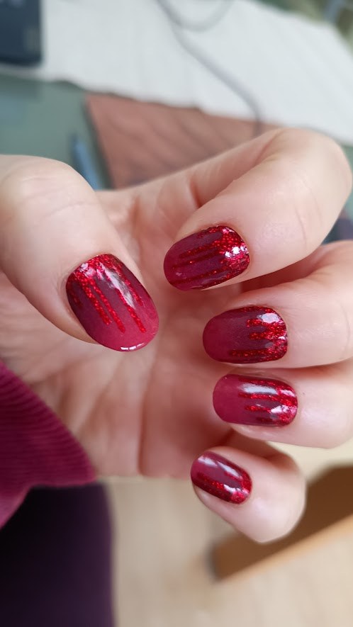 A new stunner in our Dripping series, Dripping in Scarlet is an Ombre moving from blackest red to an orange red to an almost pink red with red glitter drips