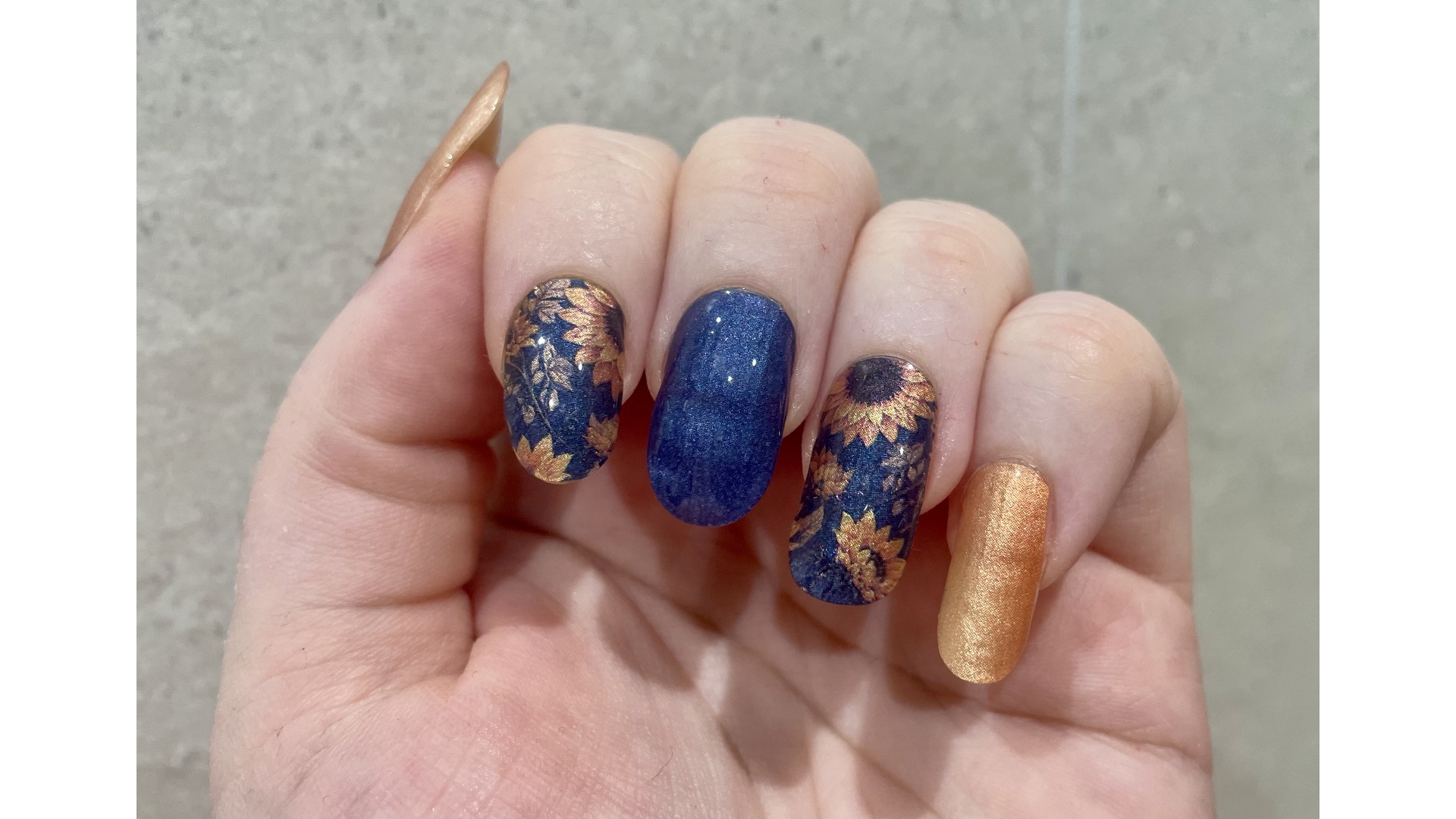 Pretty mixed mani with sunflowers on a shimmery navy blue base with matching blue and orange ombre solids .