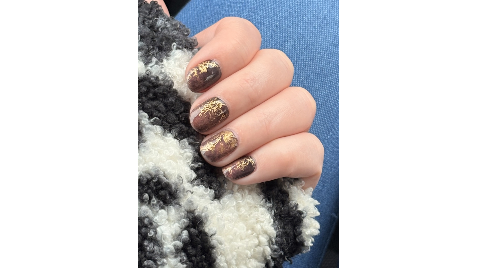 The perfect autumn wrap! Rich browns in a grunge finish background topped with curling gold metallic leaves