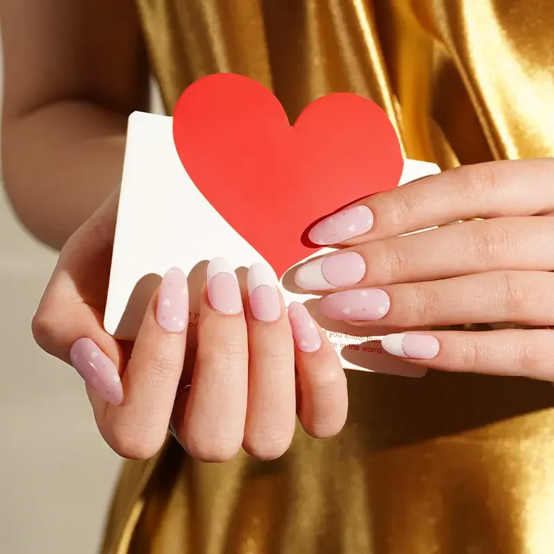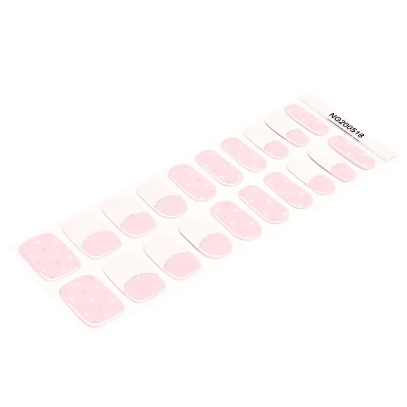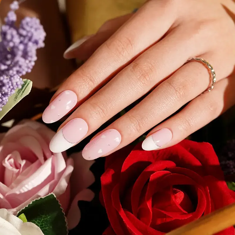 First Love is a pretty and elegant French Tip design with dainty hearts and silver glitter with a milky pink semi sheer base.
