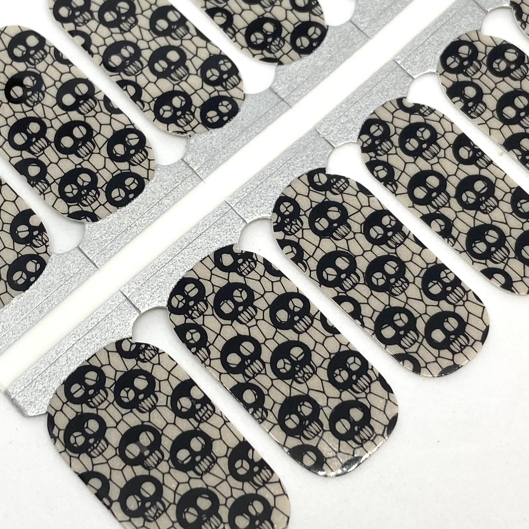 Silhouette skulls on a lacy fishnet base that glows in the dark