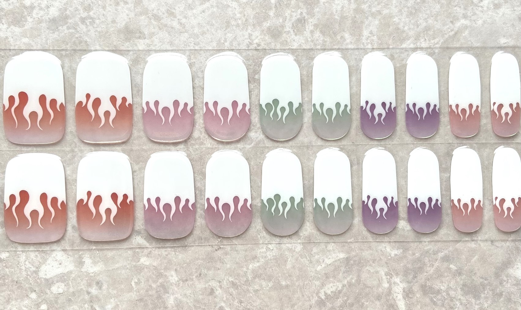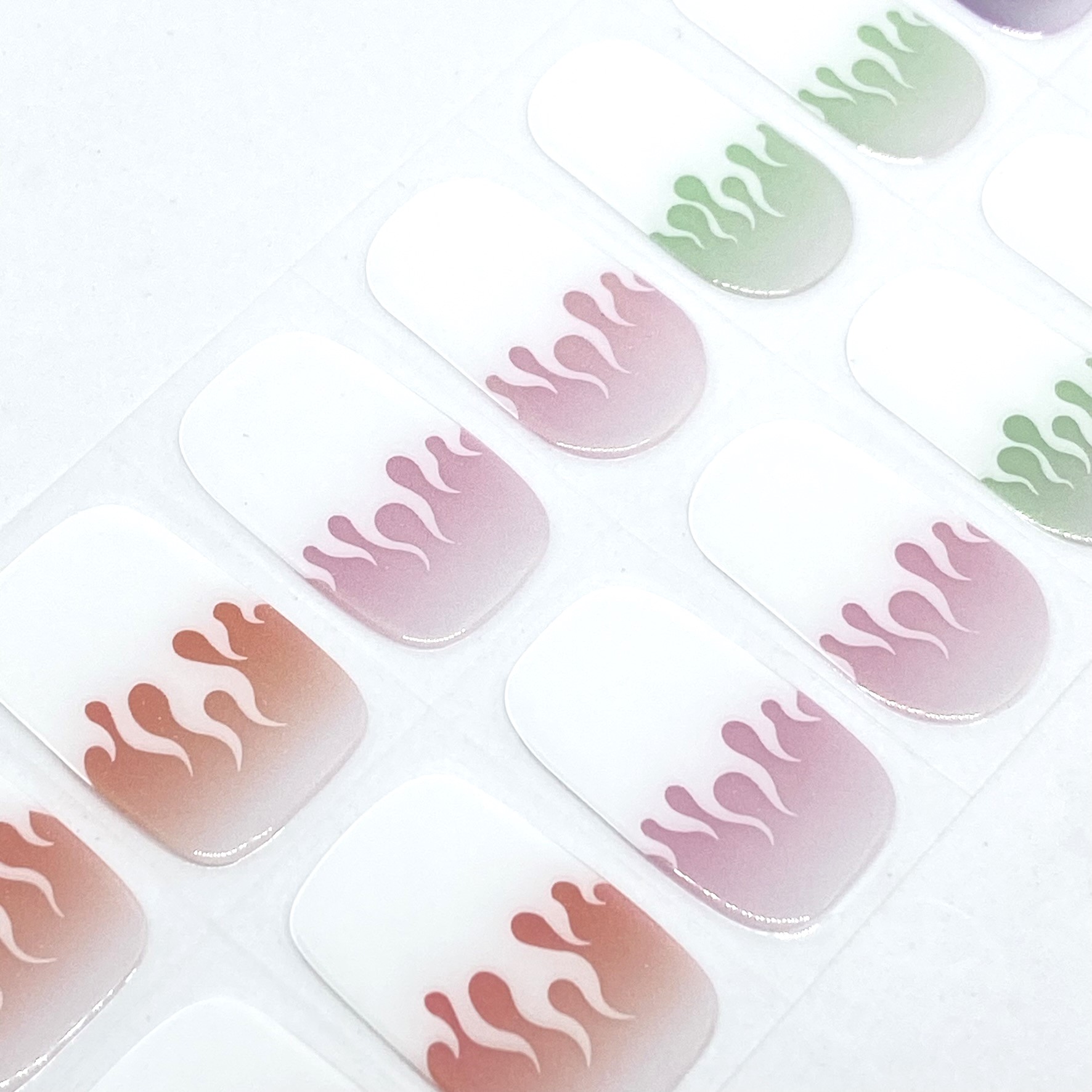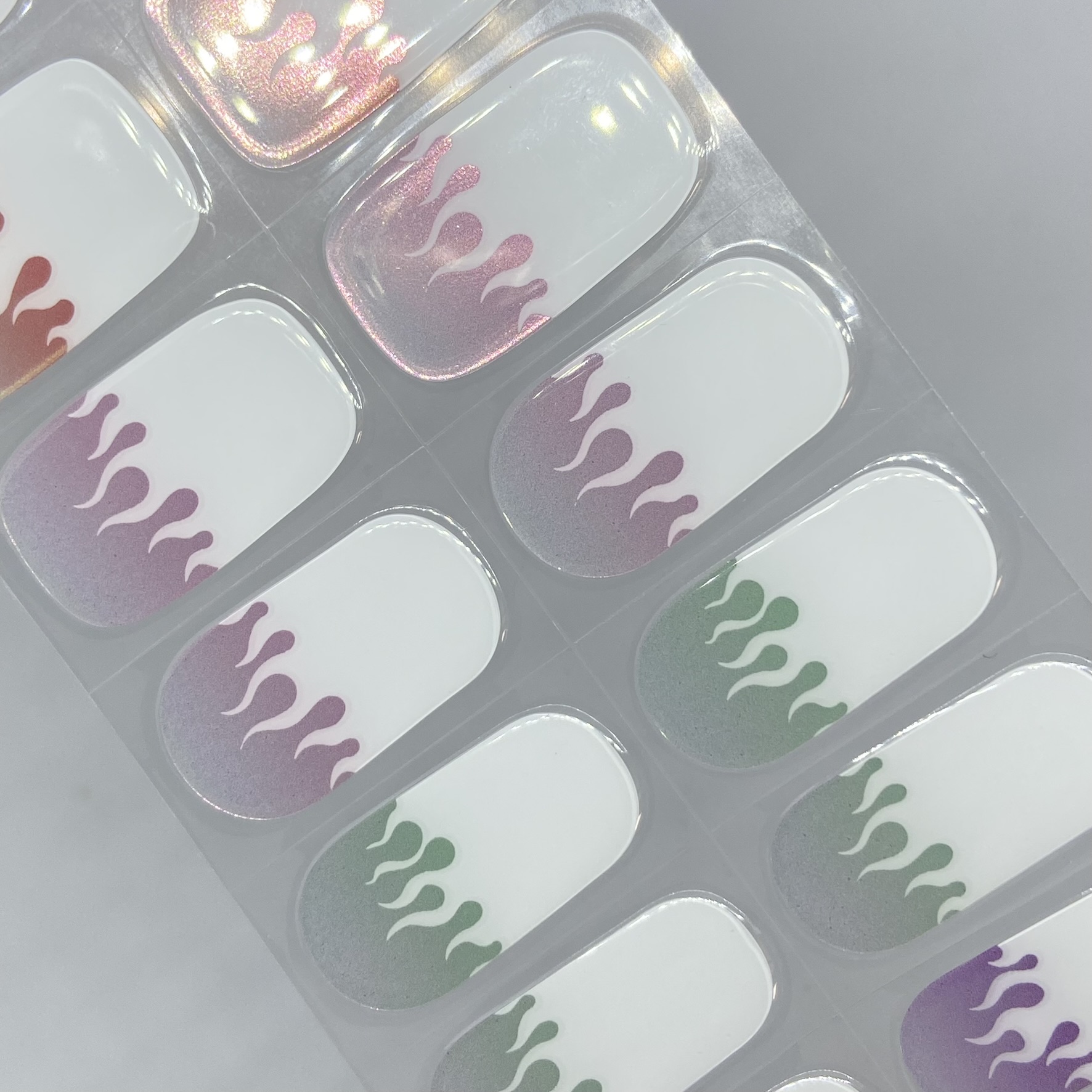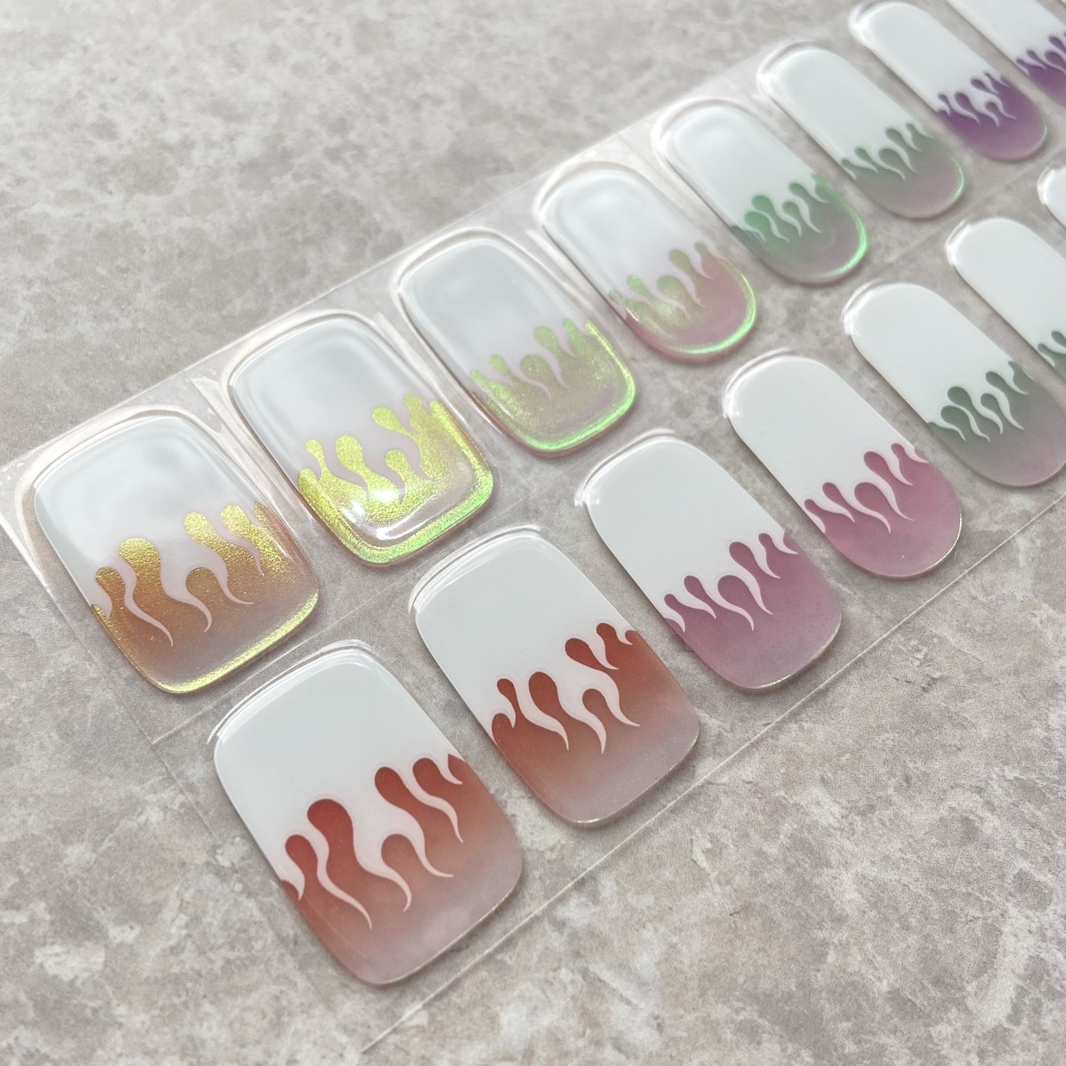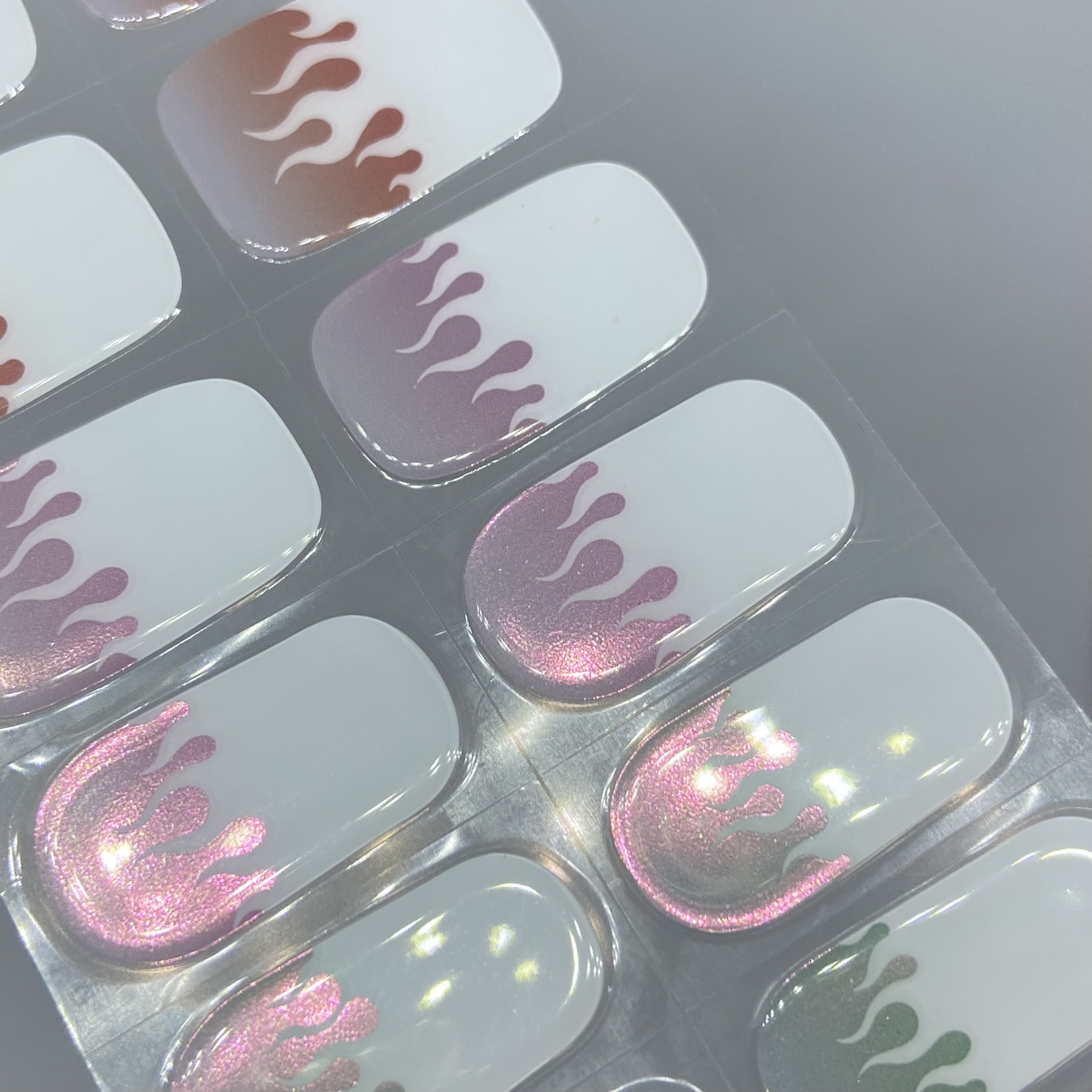 Flaming Hot features flame French tips with various coloured tinted bases with shifting chrome powder on them.