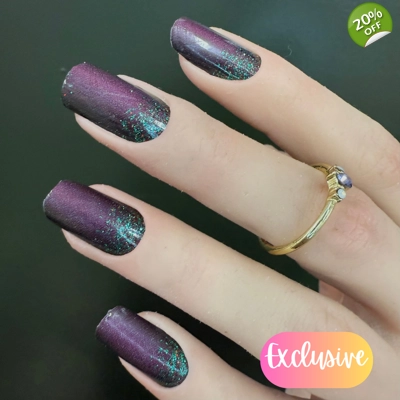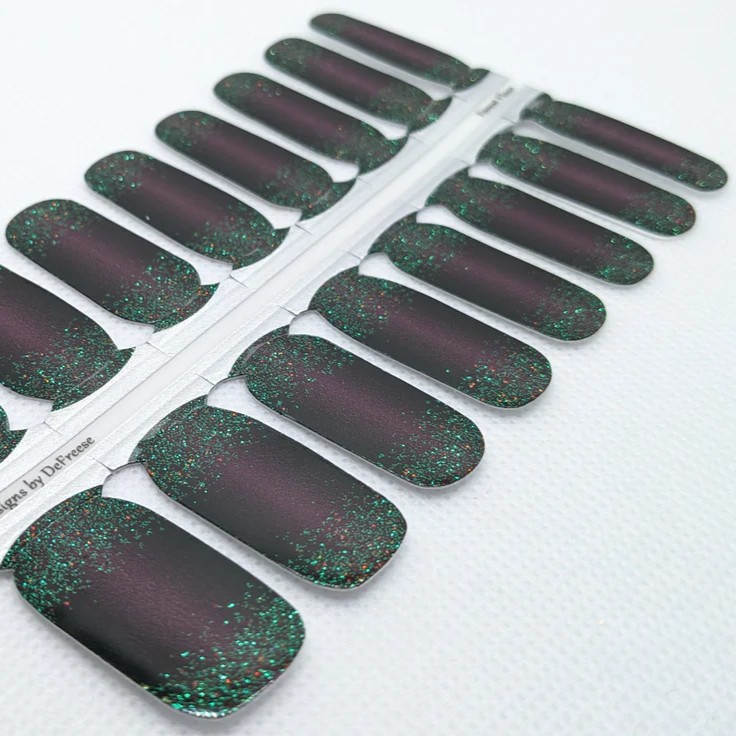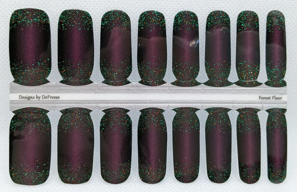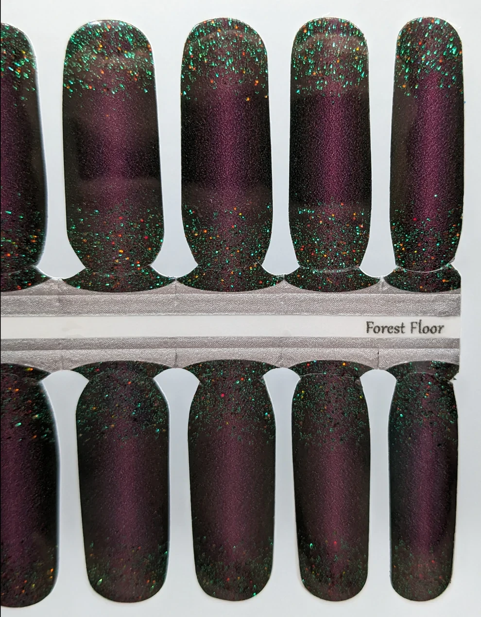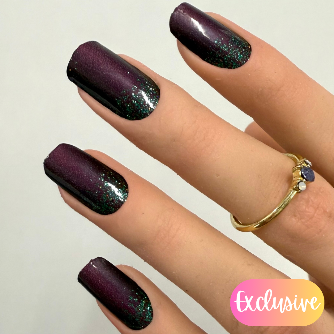 Forest Floor shimmers like sunlight through moss and shadow. A deep plum vertical ombre base fades into emerald and red glitter, creating a rich, earthy look that feels mysterious and magical. Perfect for autumn days or cozy nights, this exclusive design is dark, dreamy, and full of depth.