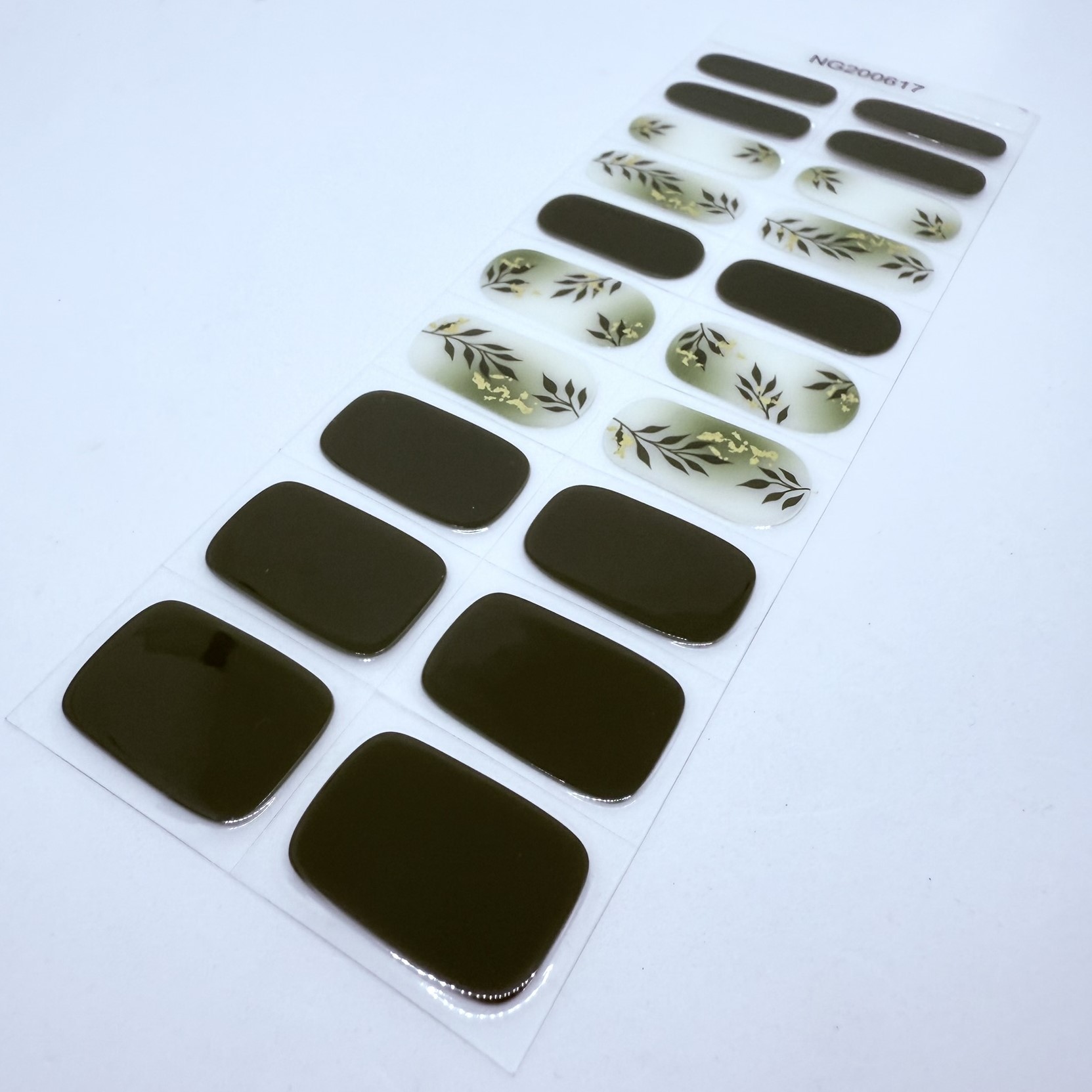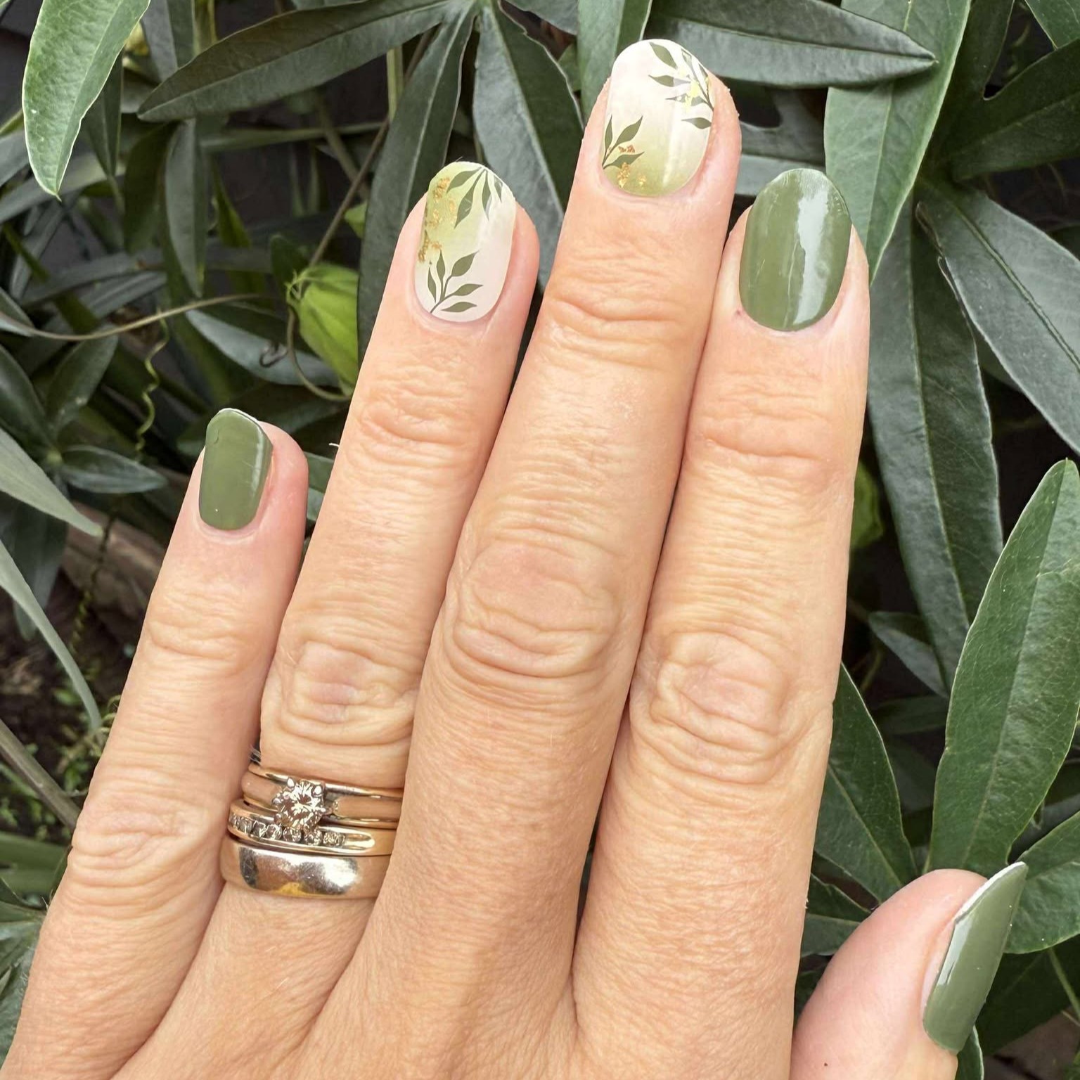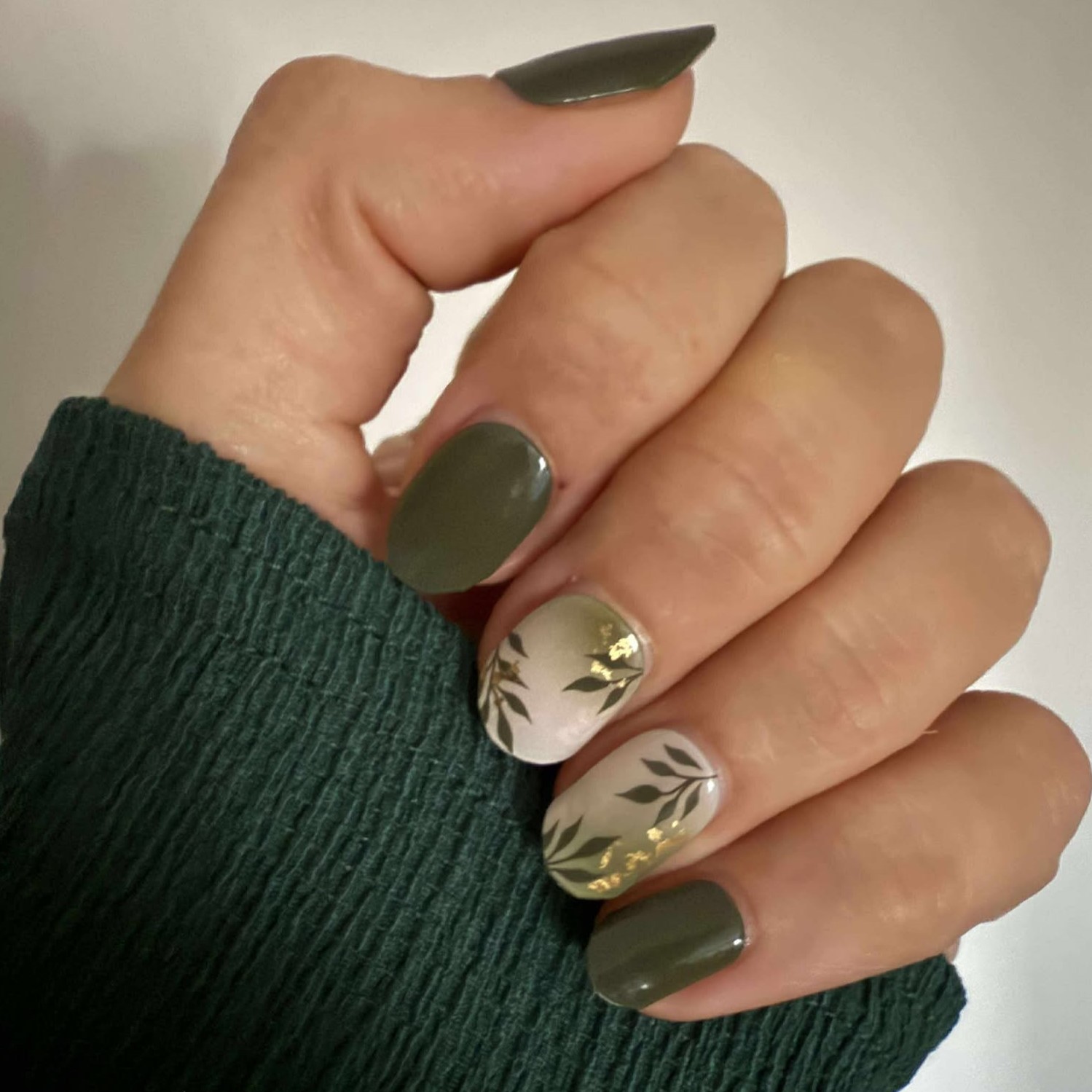 Step into effortless elegance with Gilded Leaves. This design blends rich, earthy olive tones with soft ombré whites, adorned with delicate leafy branches and touches of shimmering gold. A look that feels both grounded and luxurious, perfect for bringing a little natural glamour to your everyday style.