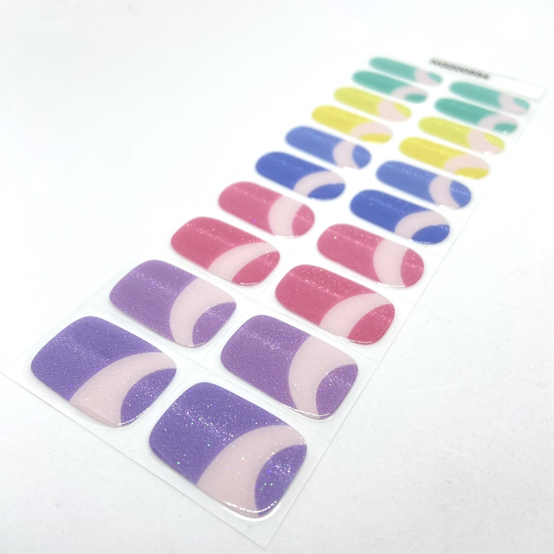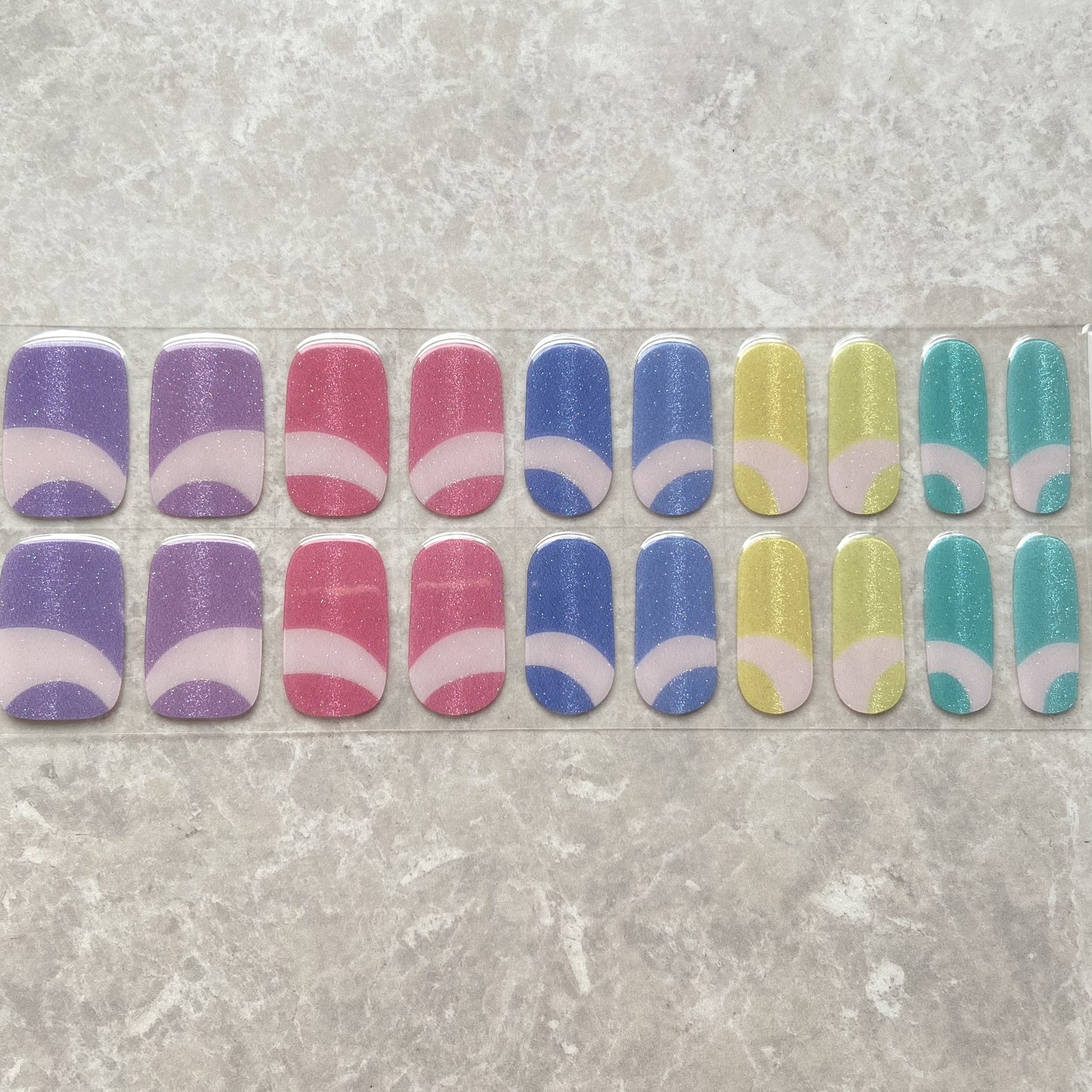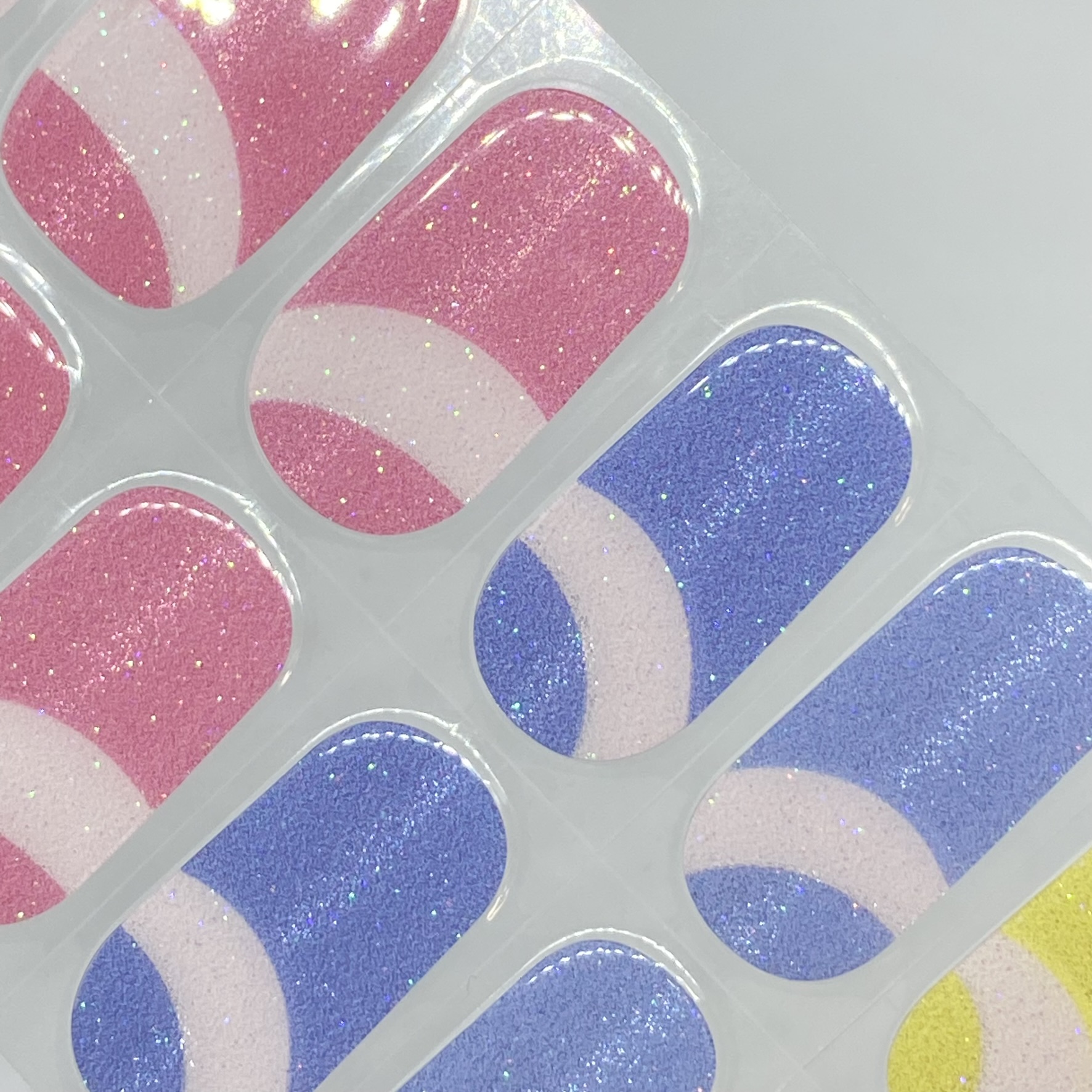 Glimpse of Colour features a mixed mani of various colours with an arch of semi sheer milky white, all with magnetic cat's eye and holographic glitter throughout.