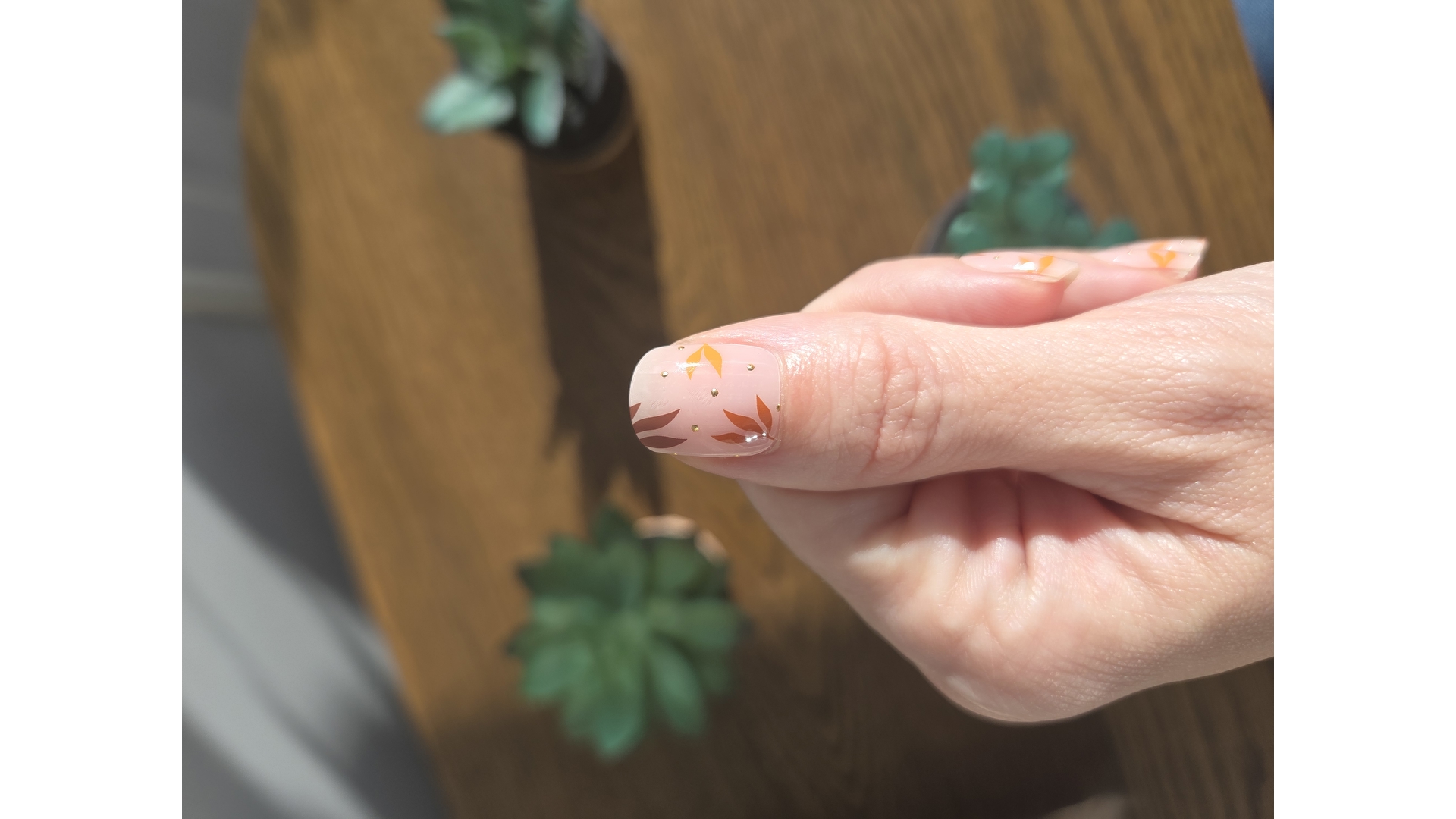 Step into autumn elegance with Golden Grove! These semi-cured gel wraps feature a dreamy milky-pink base sprinkled with delicate gold foil dots, like sunlight peeking through the trees. Scattered branches in warm caramel and deep chestnut hues bring all the cosy, autumn vibes straight to your fingertips. Perfect for those who love subtle sophistication with a touch of seasonal magic.
