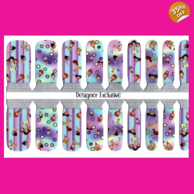 Little gymnasts on a blue, purple, pink and yellow background with some added glitter.