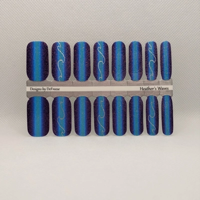 A vertical ombre in blue shades with a holographic foil wave with a shimmery pearl finish and holographic sprinkles.
