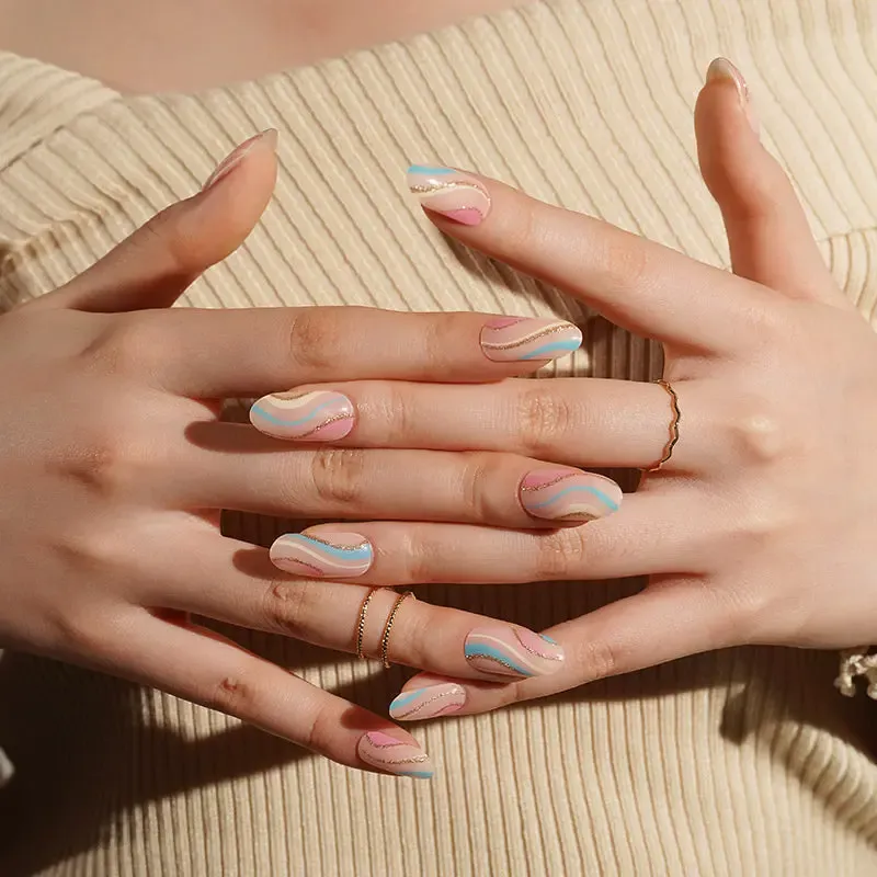 Bright pastel swirls with added glitter on a milky pink semi sheer base.