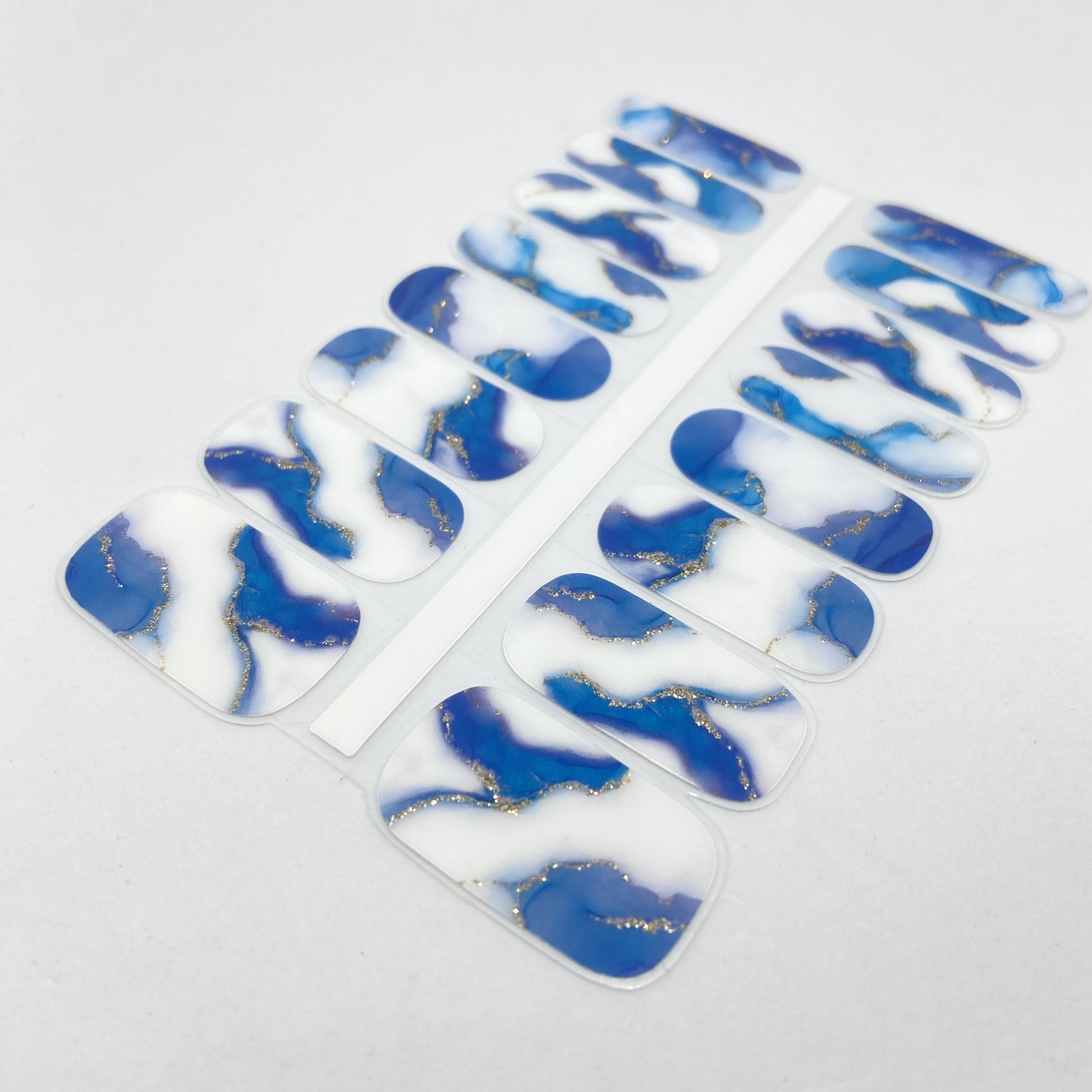 When art meets attitude, you get Inkstorm — a bold twist on the classic marble manicure. These semi-cured gel nail wraps swirl deep indigo and stormy blue over a crisp white base, accented with shimmering silver glitter veins for a flash of lightning in every flick of your fingertips.