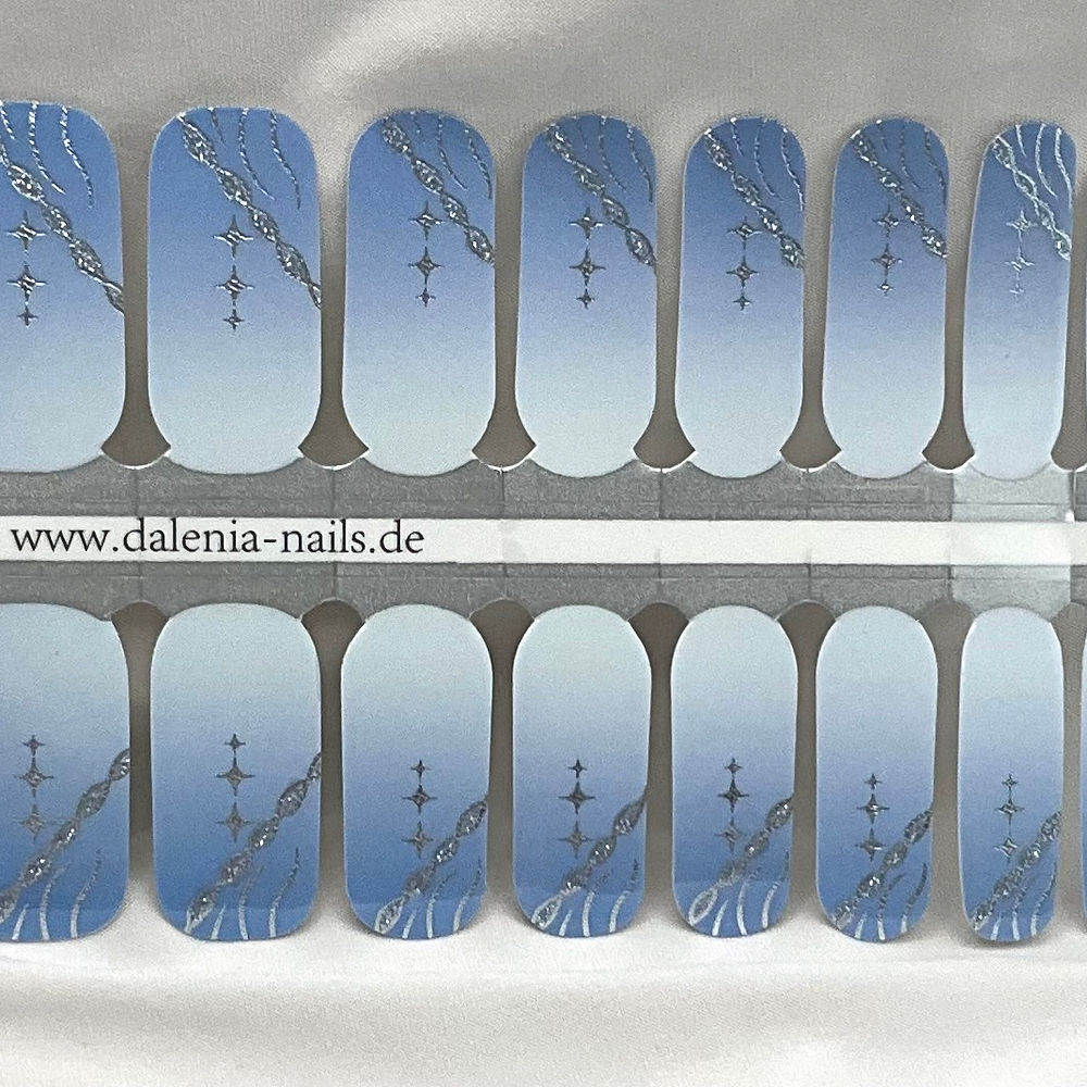 Isabell Blue is a soft, dusky blue base with delicate silver swirls and star accents that shimmer beautifully in the light. Calm and elegant with a hint of magic, this design feels dreamy yet refined.