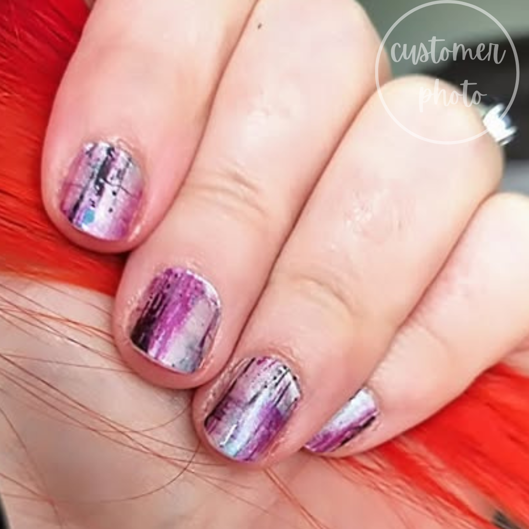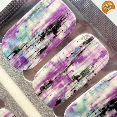 Paint like drips and splatters in aqua, black and lilac-pink on a mother of pearl background.