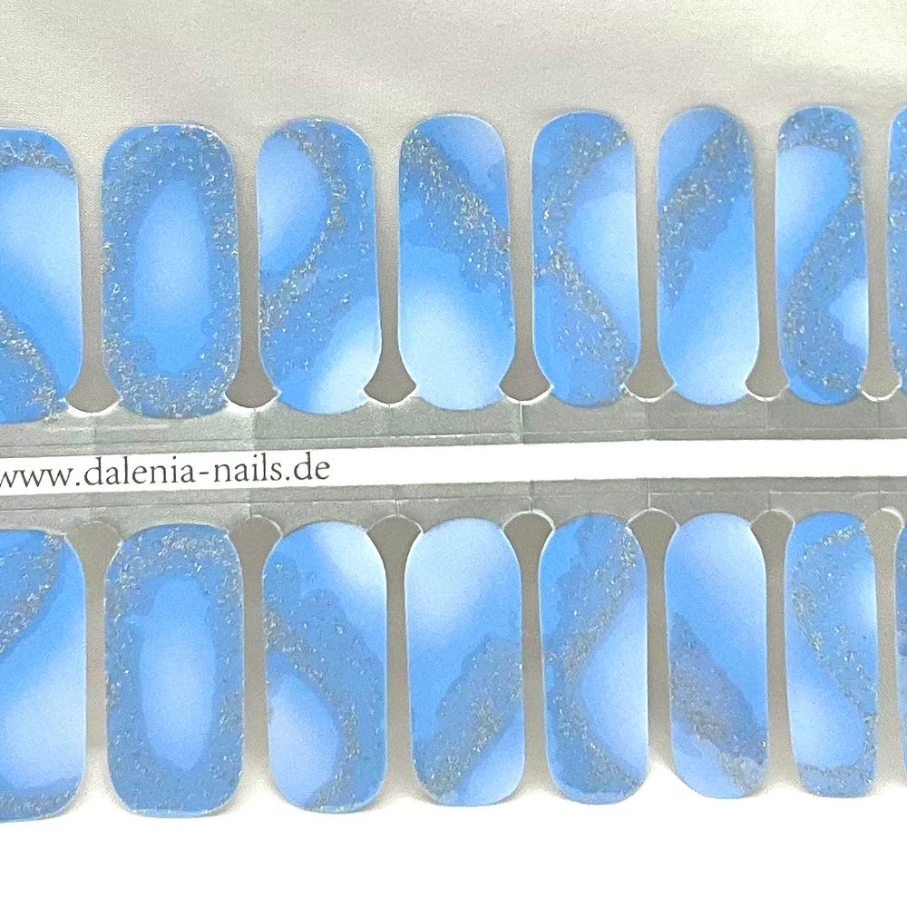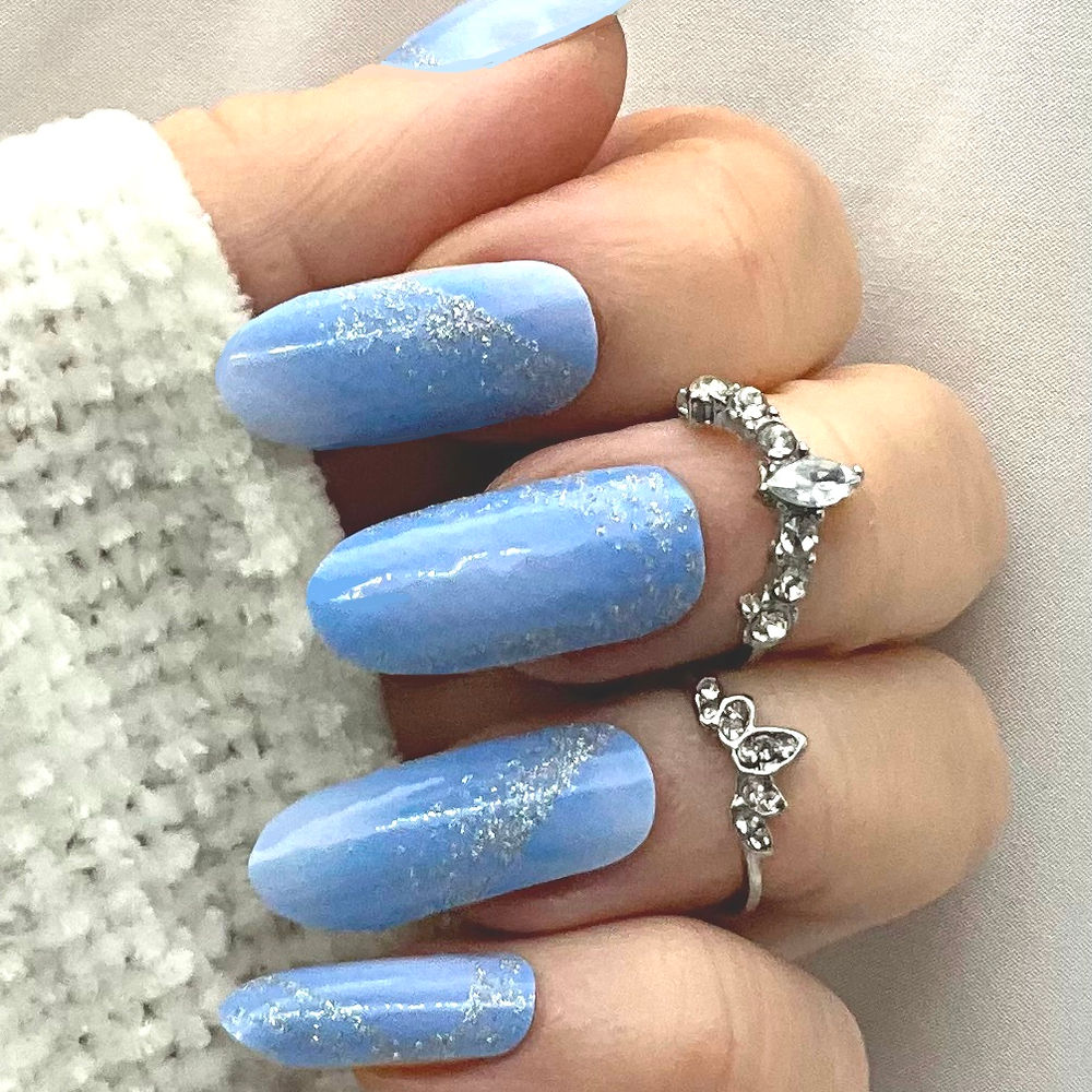 A dreamy sky blue with gentle tonal swirls and a touch of silver glitter running through it. Light, airy, and easy to wear, like a little moment of calm at your fingertips.
