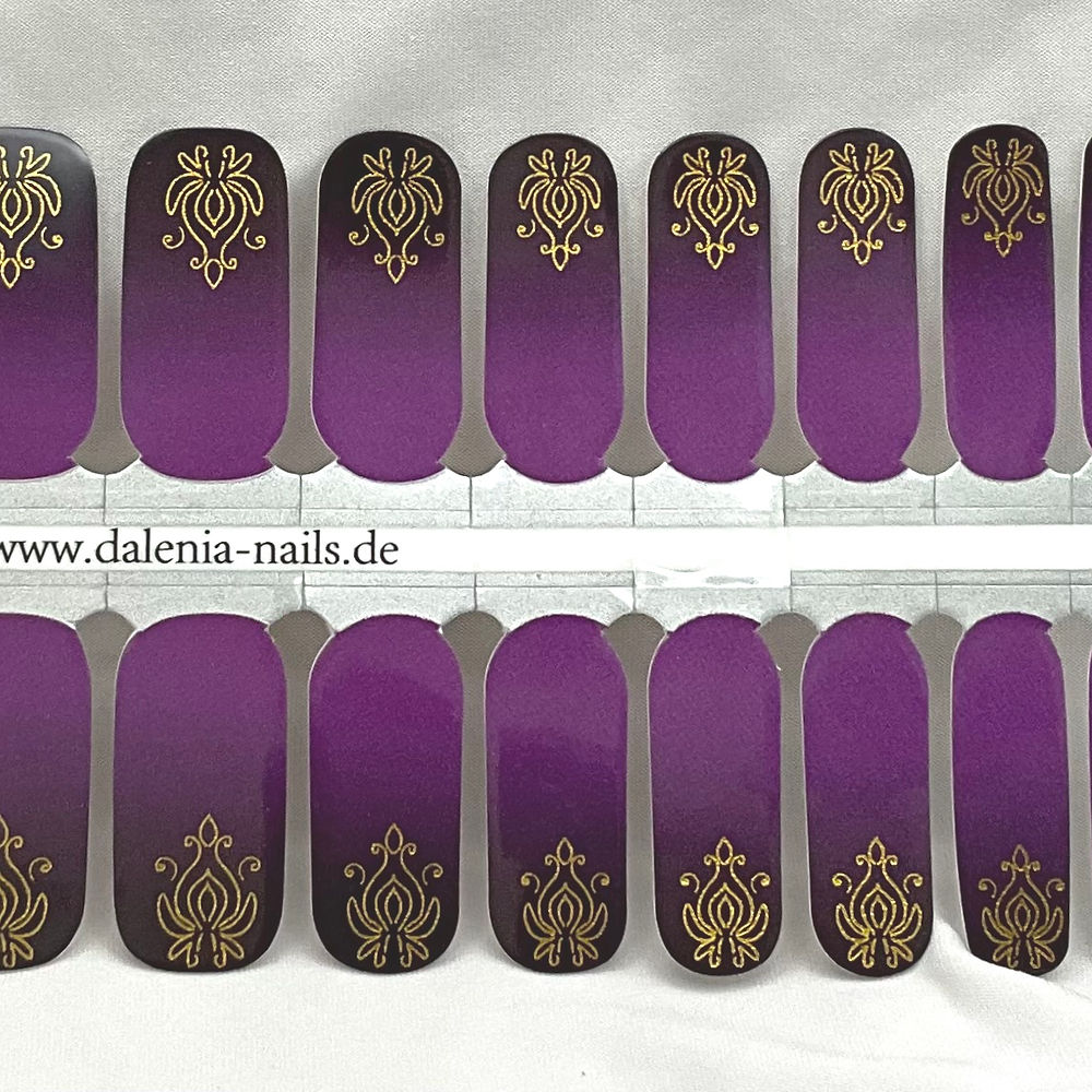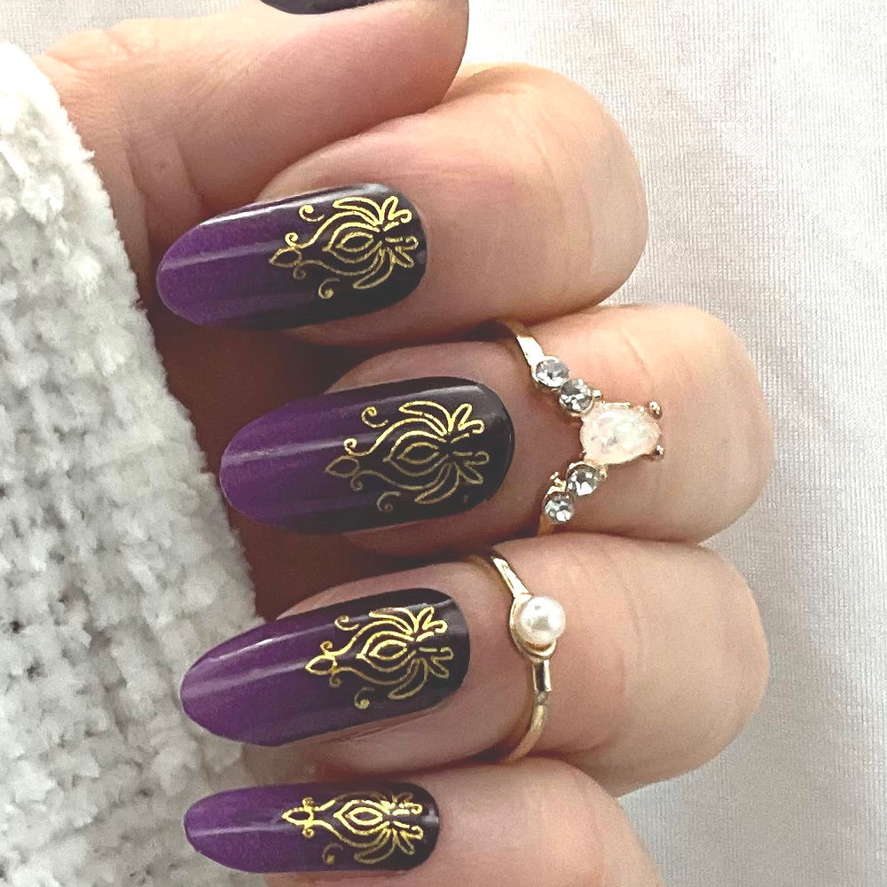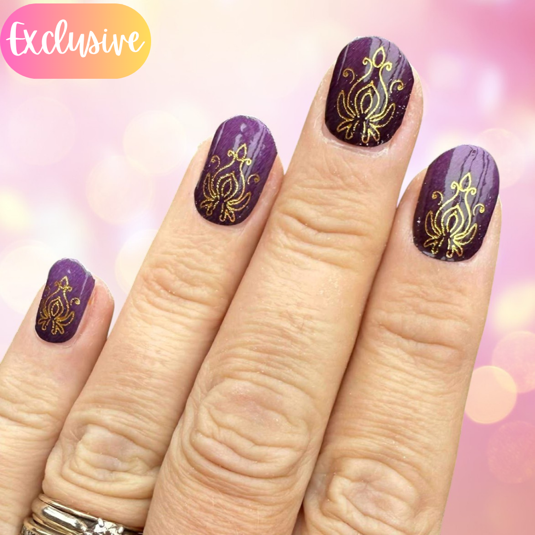 Lotus Lilac combines rich violet tones with a golden lotus design, creating a look that’s luxurious, mysterious, and effortlessly elegant.