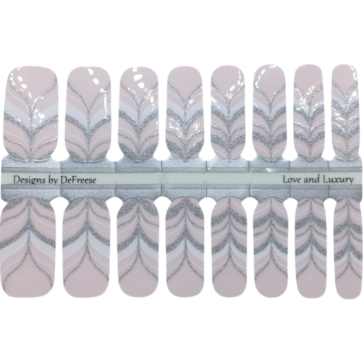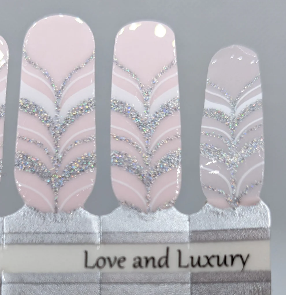 Love and Luxury features elegantly drawn lines of white and silver holographic glitter on a semi sheer milky pink base.