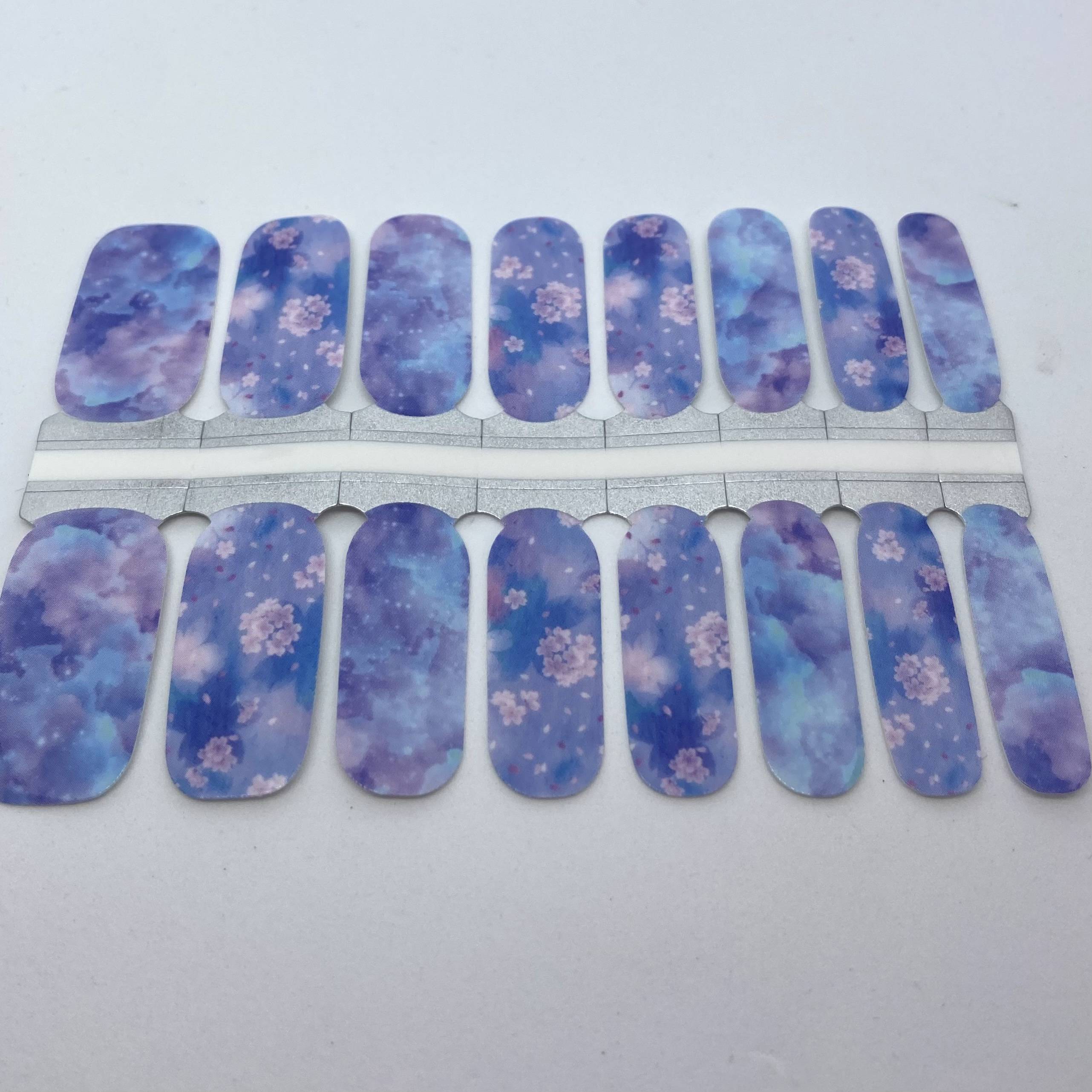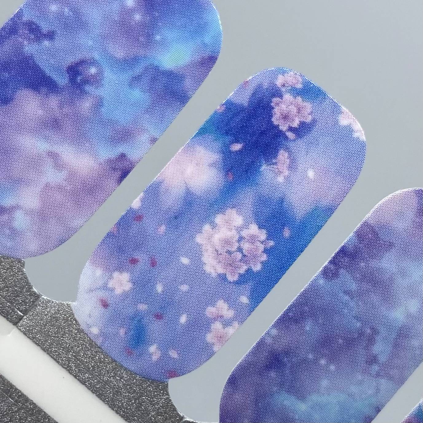 Pink flowers on a blue and lilac watercolour galaxy background.