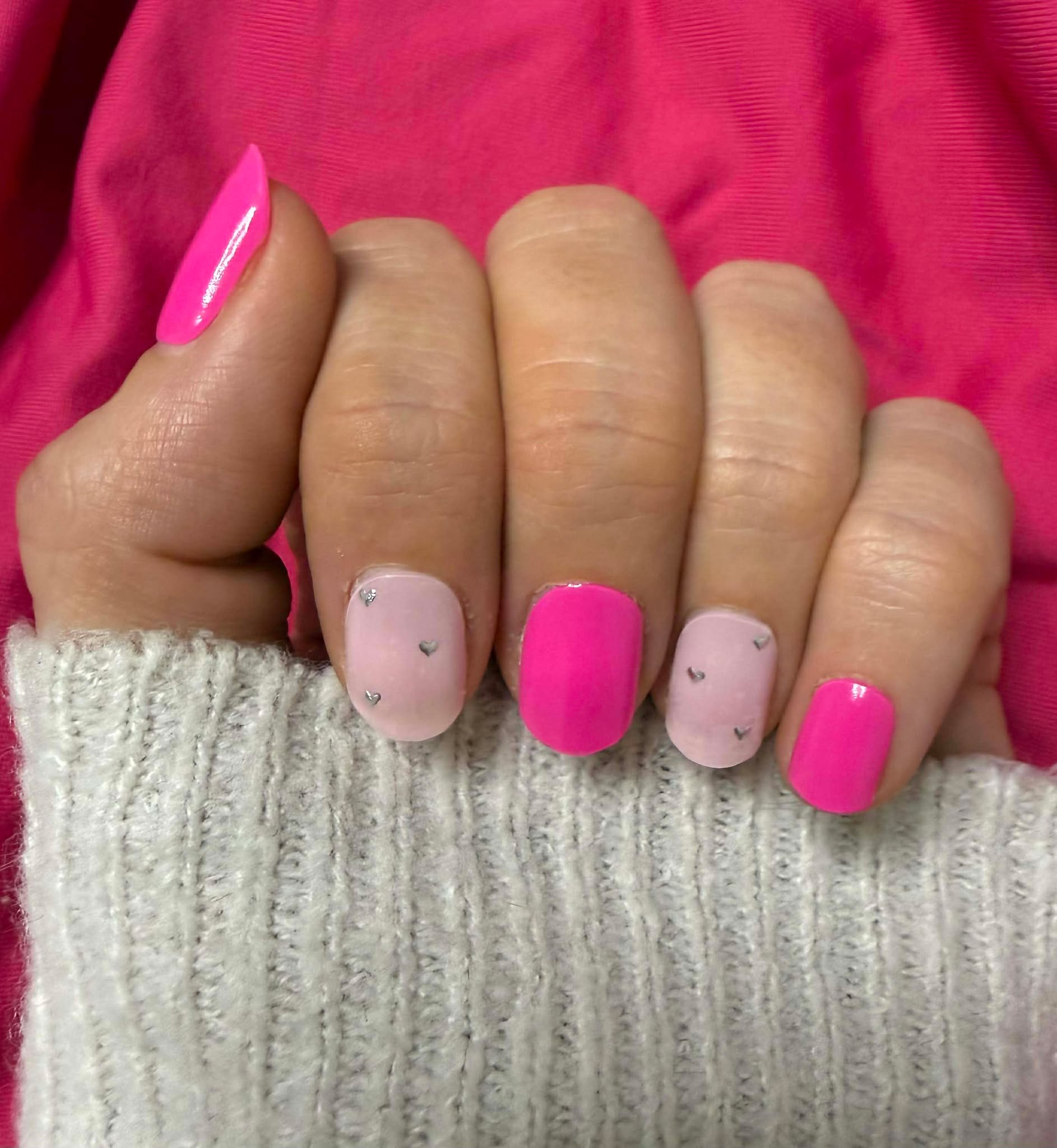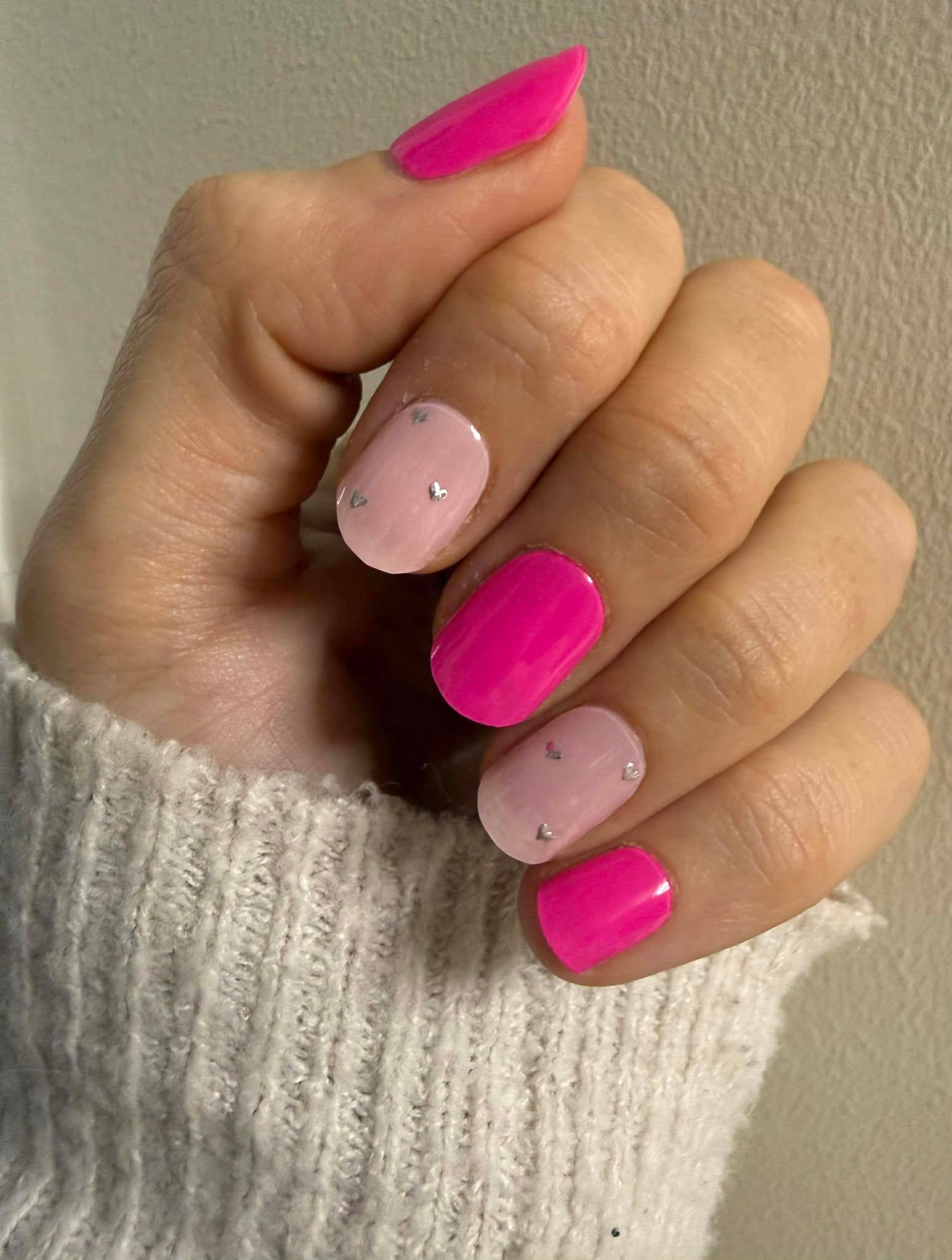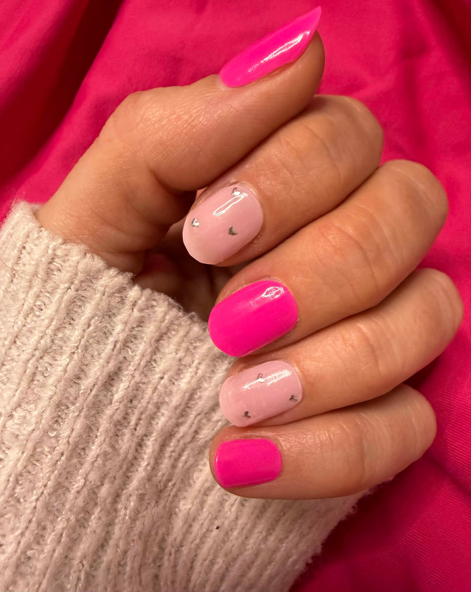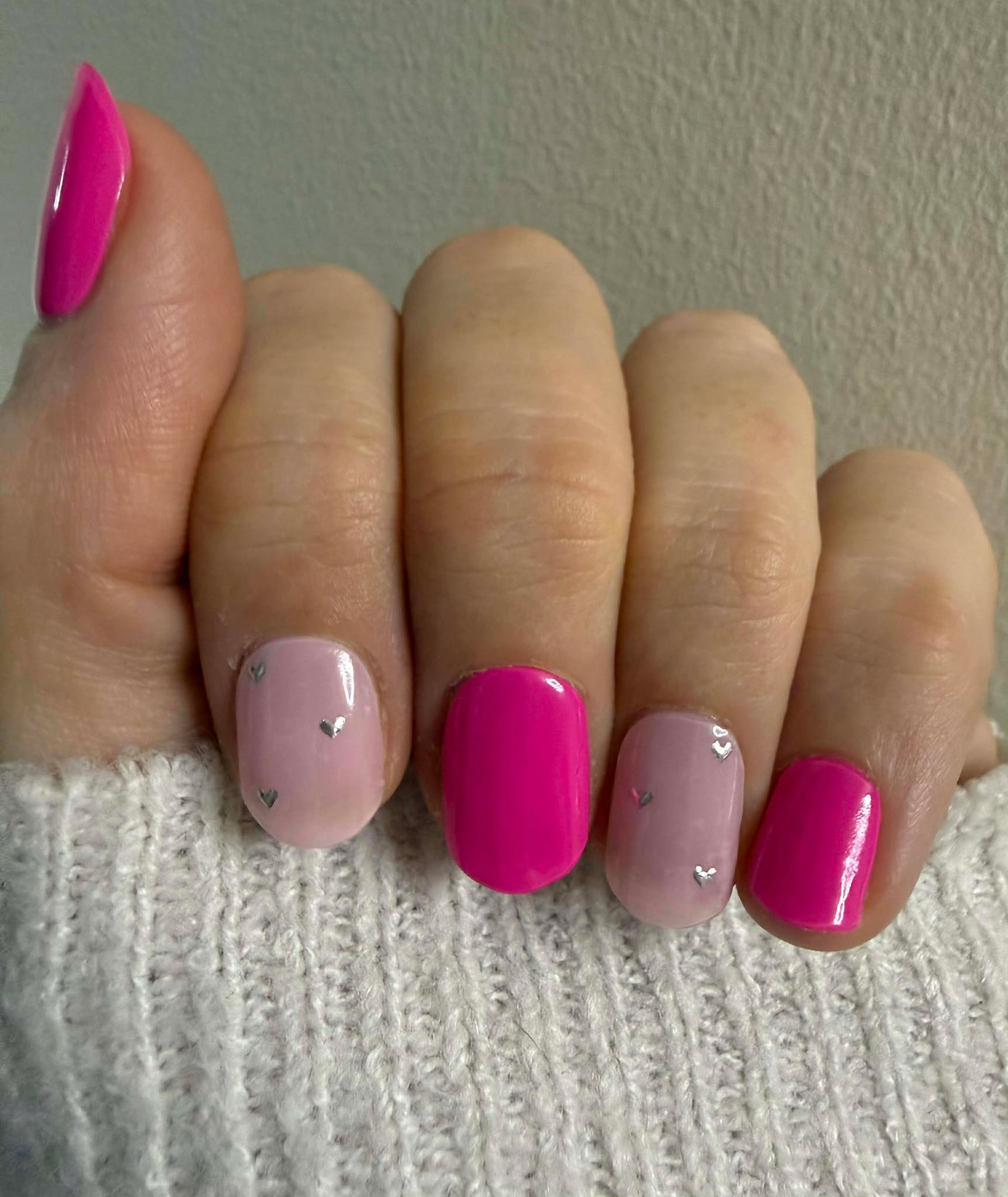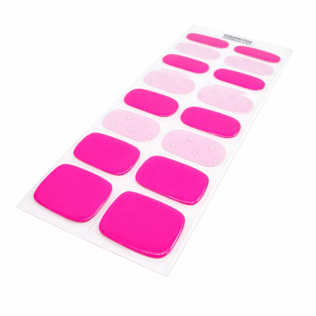 A bright neon Barbie pink brings all the energy, paired with a semi sheer pale pink base sprinkled with tiny metallic silver hearts. Fun, fearless and unapologetically bold, this set is made for main character moments only.