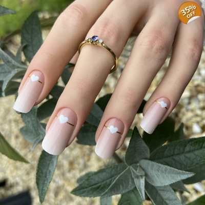 Lovely Boomer is an elegant glossy peach pink to white baby boomer design with a simple white heart and gold foil line.