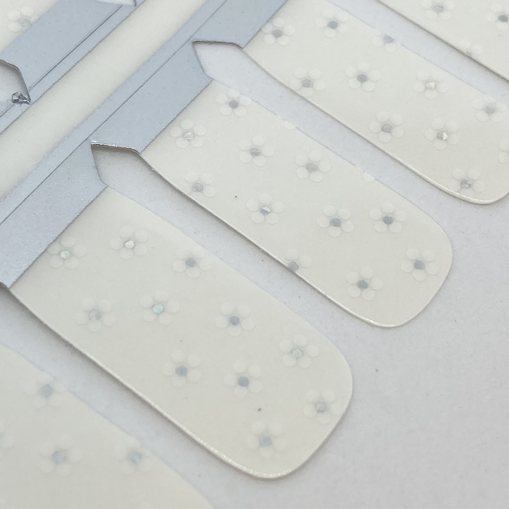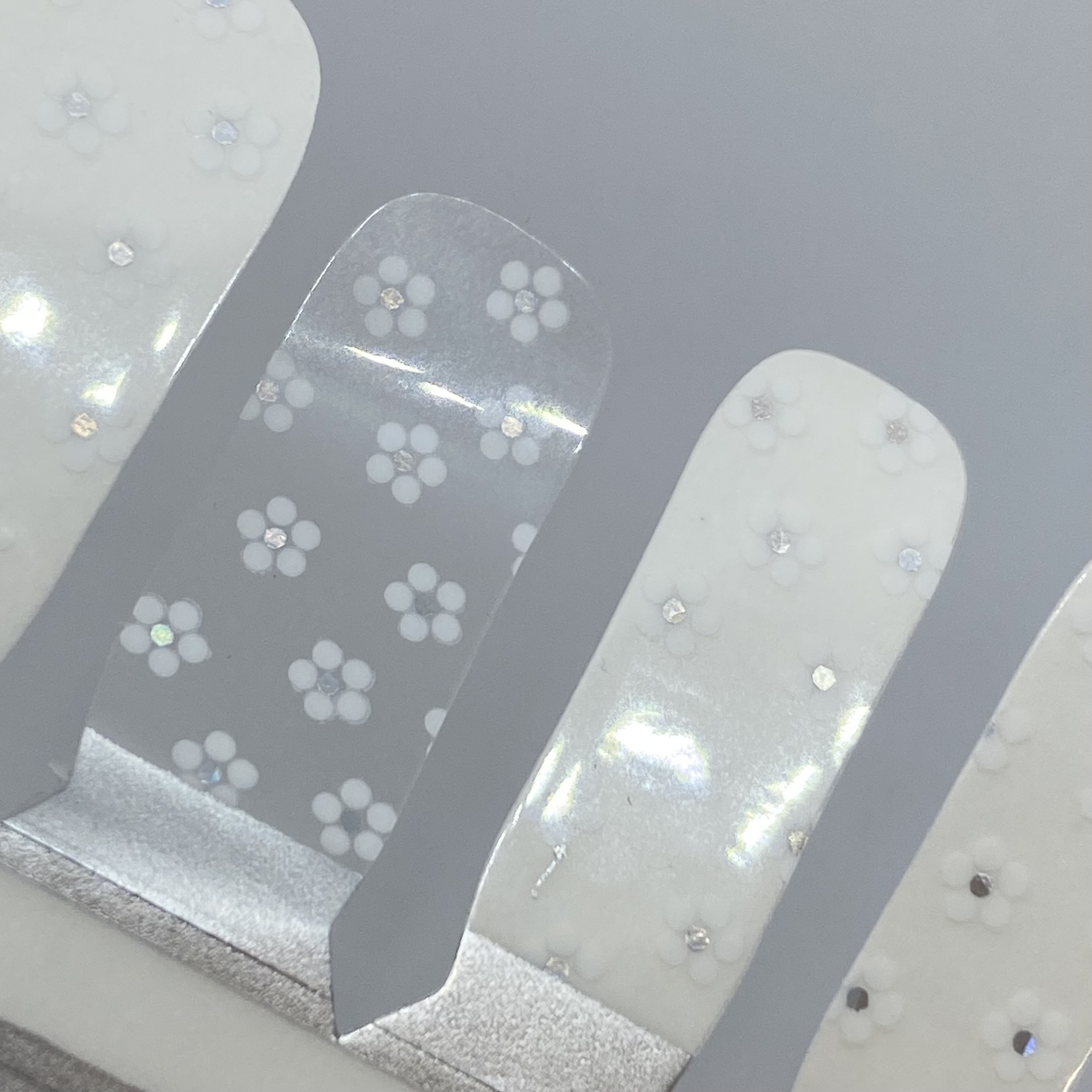 ✨ Lunar Petals features delicate white flowers grace a clear base with sparkling holographic foil centers in Luna Petal Minis. Perfectly sized for tiny nails, this elegant and fresh design adds a subtle shimmer and a touch of magic to every little mani.