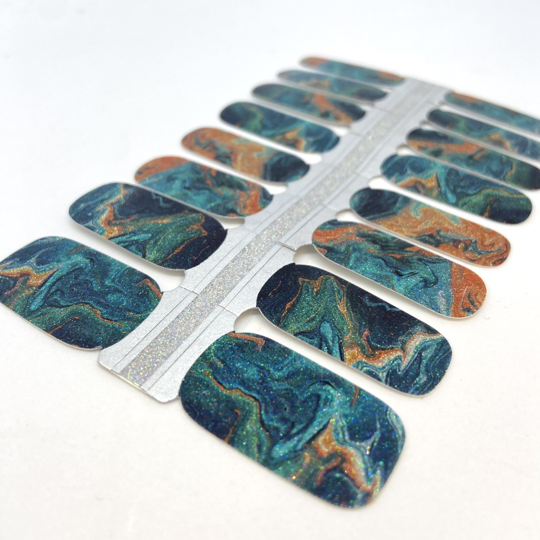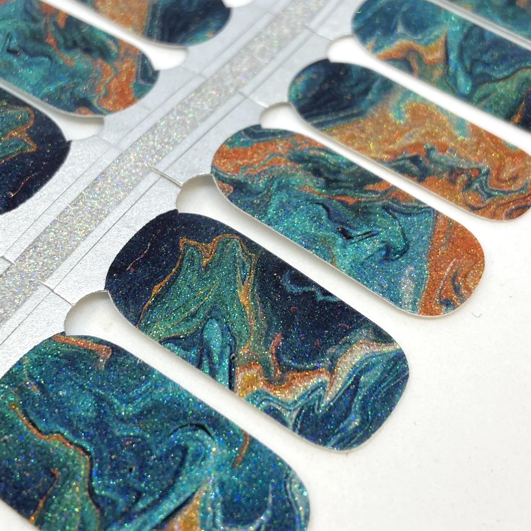 Channel the beauty of natural stone with Molten Marble! This wrap swirls rich teal, deep navy, and molten copper tones with a glimmering holographic finish, mimicking the stunning flow of polished geodes and marbled minerals. It's bold, elegant, and effortlessly luxurious—perfect for nails that look like they're carved straight from the earth’s treasures.