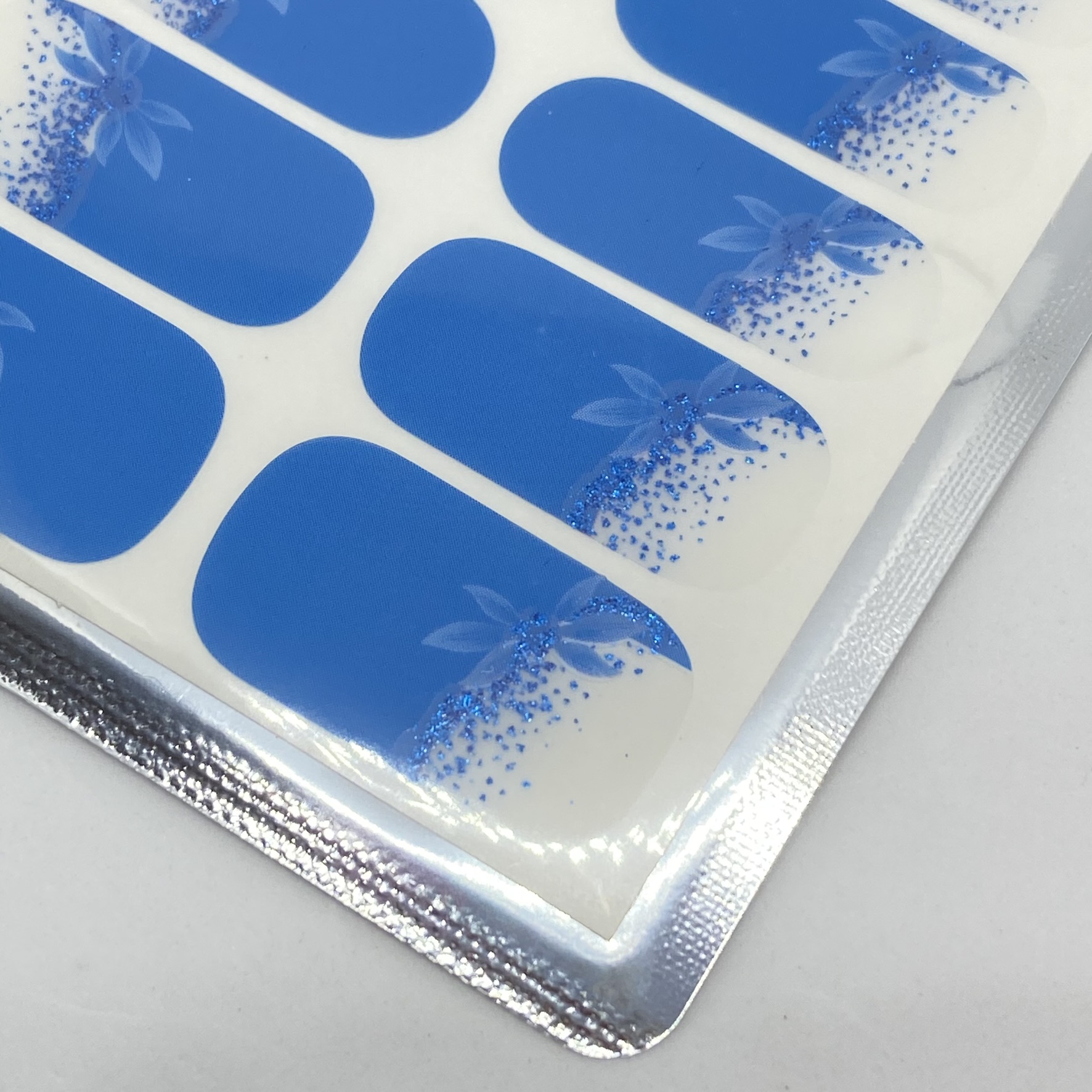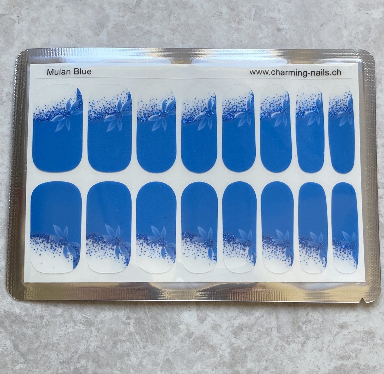 Mulan Blue is an alternative French tip in blue with blue glitter and a delicate flower with a transparent base. Wear alone or layered over another colour.