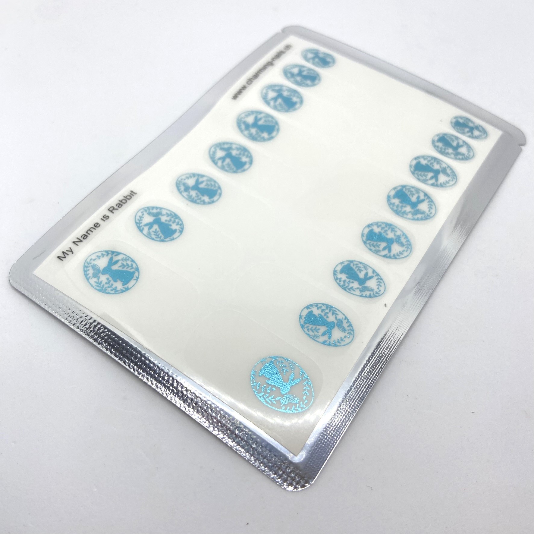 My Name is Rabbit is a super pretty transparent based design with little rabbits inside an egg shaped oval in a light blue metallic foil.