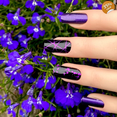 Gorgeous mixed mani with metallic purple lines and splashes, and black solids topped with purple mermaid/aurora chrome powder