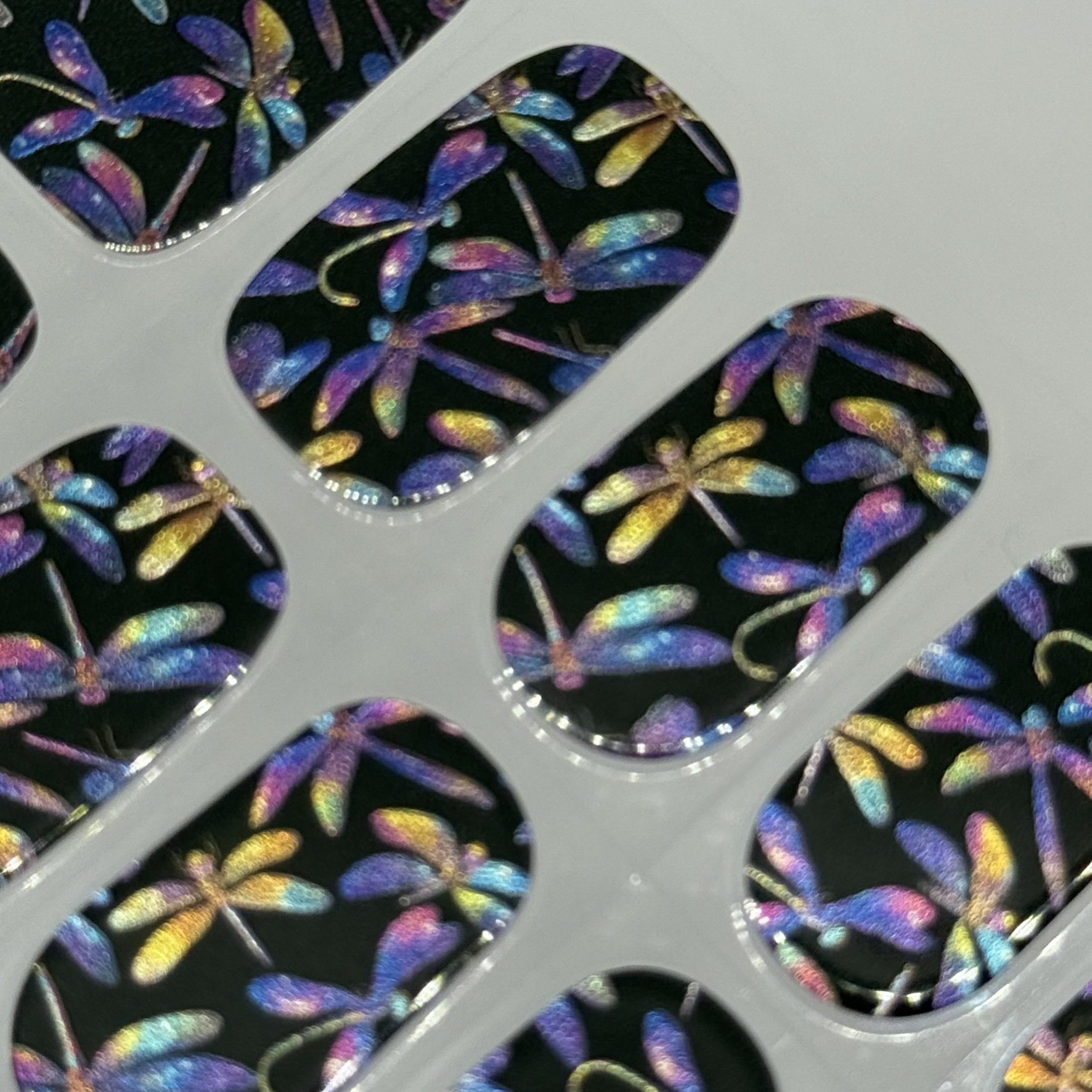 A glossy jet black base brought to life with iridescent wing details that shift through jewel tones as they catch the light. Deep, dramatic and endlessly captivating, this design feels like twilight on your fingertips. Statement making yet refined, perfect for evenings out or whenever you want your nails to feel a little bit magical.